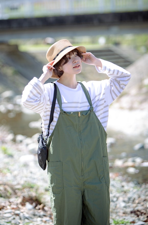 これからの季節、子供たちが大好きなのが水遊び。ラクチンなオーバーオールに足元は防水機能のあるスニーカーで快適に。ワークテイストになりがちなスタイルも麦わら帽で軽やかに。濡れると体温が下がるので、遊んだ後は雨や風に強いマウンテンジャケットを持っていると心強いですよ。