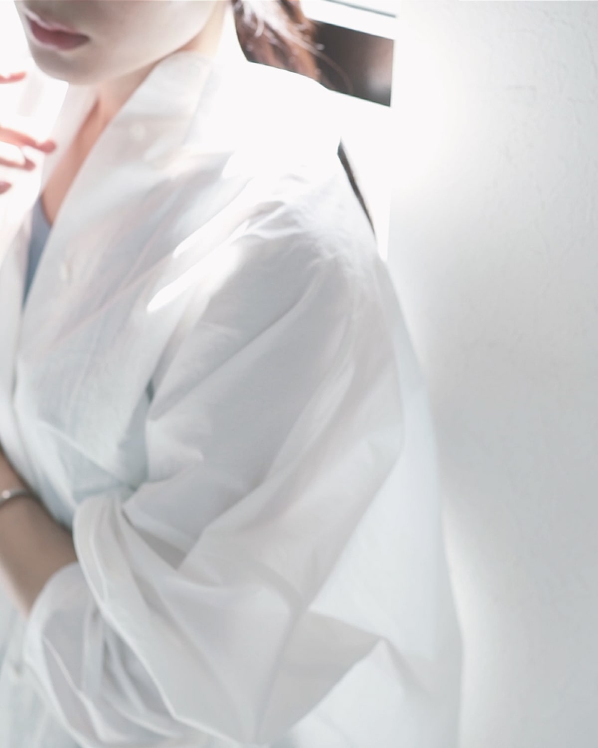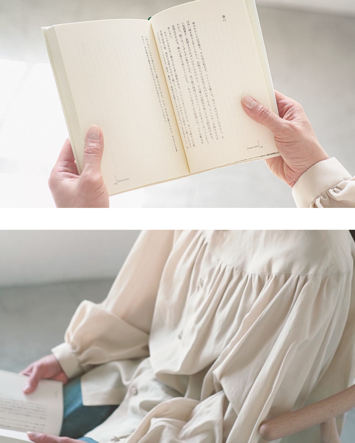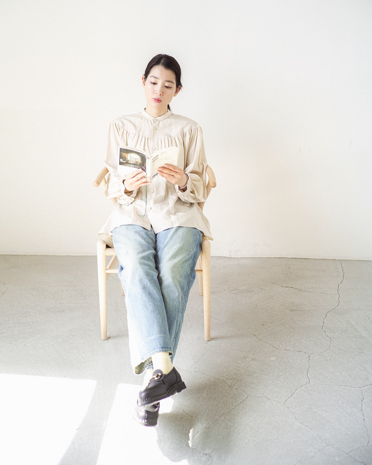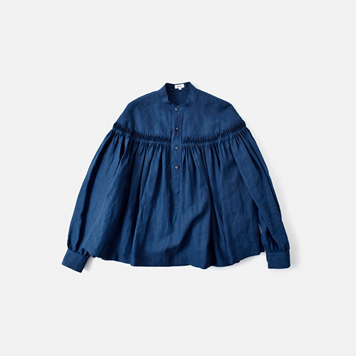 空気を含んだエアリーなドレープが美しいギャザーシャツ。ヨーク下から袖にかけてたっぷりと施されたドレープが綺麗な立ち姿を演出。