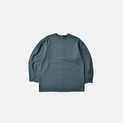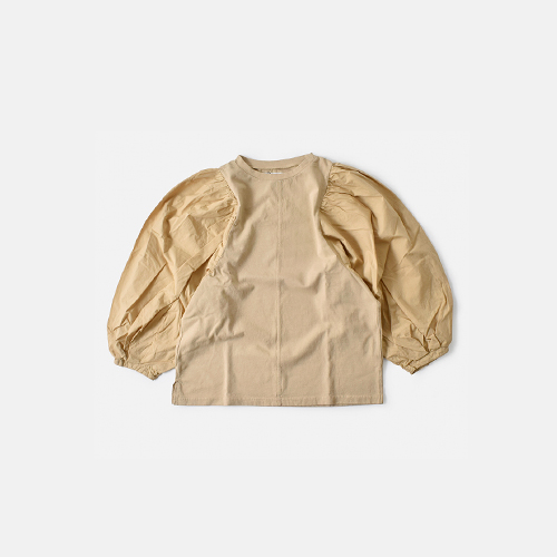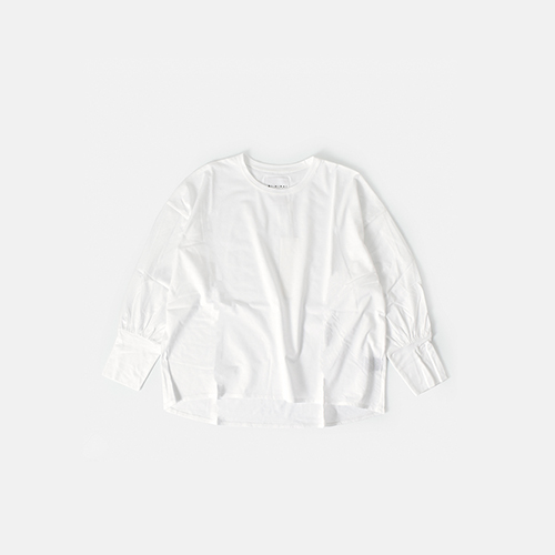インドの超長綿を空紡糸にし、肉感の度詰天竺に編み上げた素材を使用。つぼみのような特徴のあるタックスリーブがポイント。