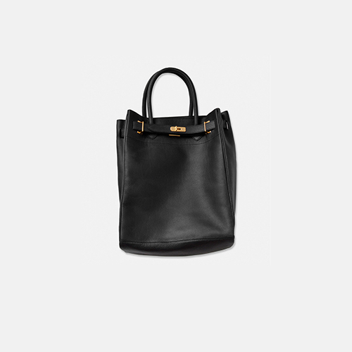 シンプルながら重厚感のあるトートバッグは、あえて底板や底鋲を付けない事で気負わずラフに持てるデザインに。シボ感のあるレザーにゴールドパーツが映える仕上がり。