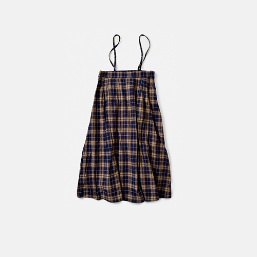 ヴィンテージライクなチェック生地のスカート。長さ調整が可能で、吊りスカートのように着たり、ストラップを隠してロングスカートとしての着用も。