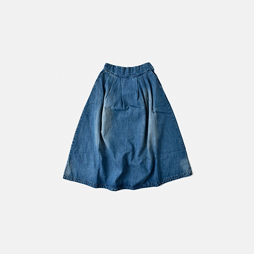 タックを施すことで着用すると立体感が生まれ、ドレープも美しいデニムスカート。後ろウエストにはアジャスト可能なゴムを備えサイドジップで着脱もスムーズ。