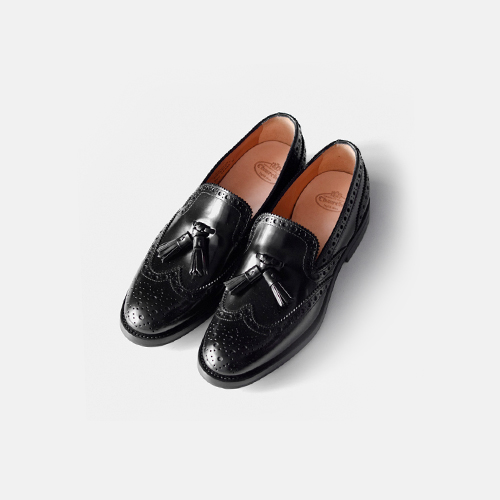 上質なポリッシュドバインダーカーフをアッパーに使用し、メダリオンを散りばめたウイングチップ仕様のクラシックなローファー。