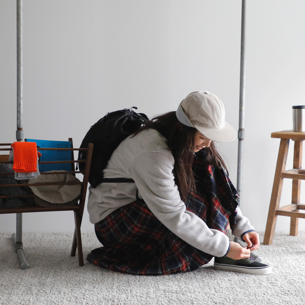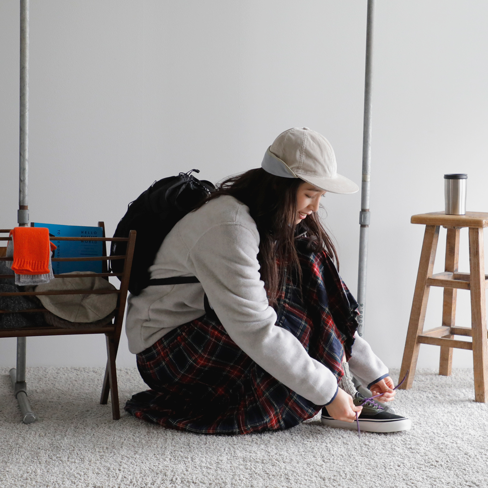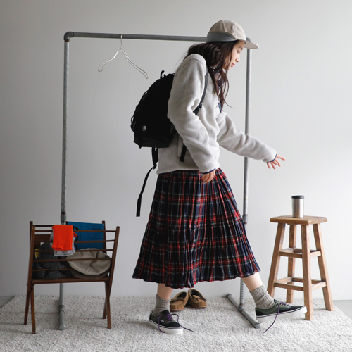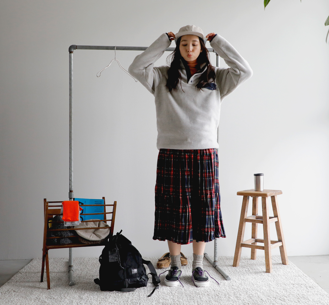 パタゴニアの新作のフリースを主役にスタイリング。スナップTのクラシカルな雰囲気が今っぽい装いに。インナーは温かなタートルネックを入れて、アクティブかつ温かな装いを目指します。ボトムは、パンツと迷ったけれど、ロックマウントのチェックのスカートに。公園といっても、走り回るわけじゃないから(笑)これくらいがわたしらしくてちょうどいい◎。コンパクトだけど、お弁当・水筒・おやつに、ストール・敷物が入るカリマーのバックパック。耳当てがついたパープルレーベルのフィールドキャップは防寒性以上にかわいさ重視でオン!