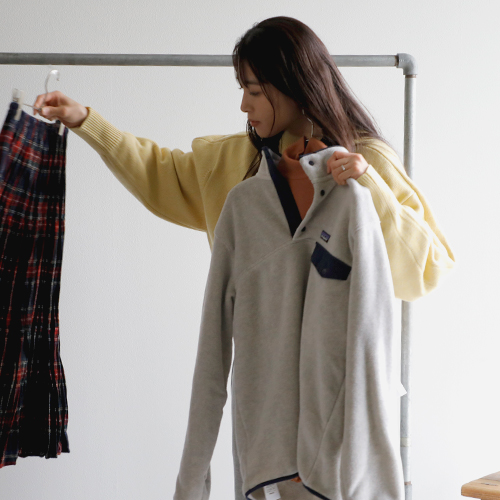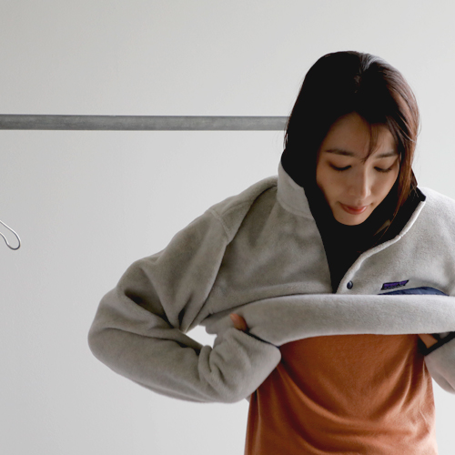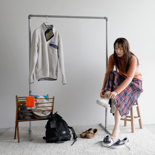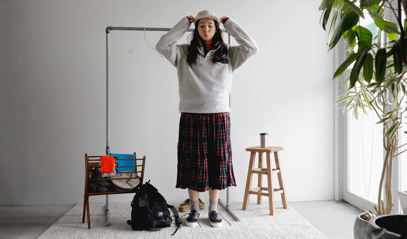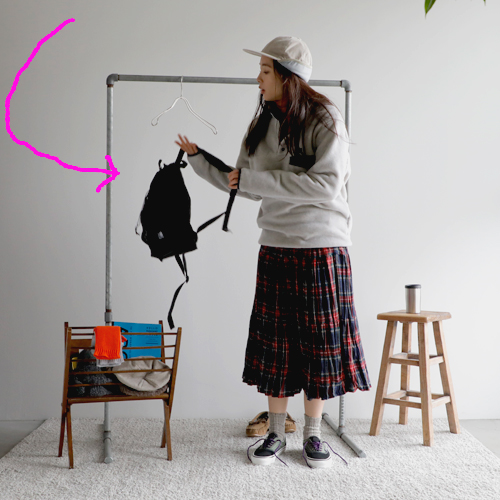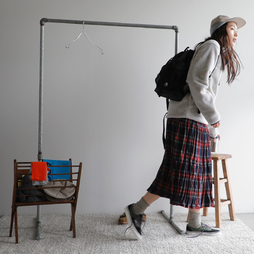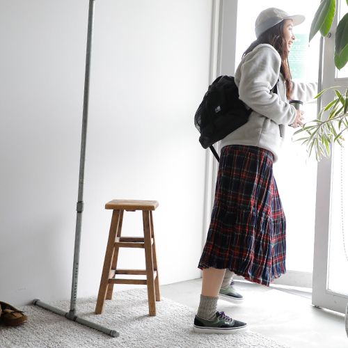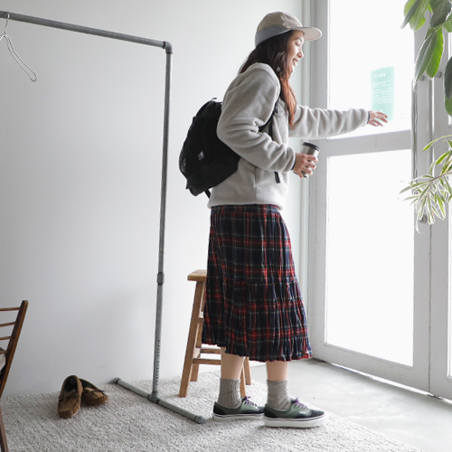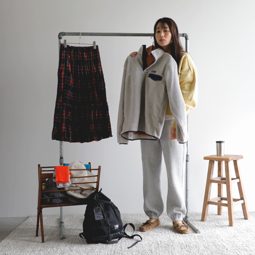 パタゴニアの新作のフリースを主役にスタイリング。スナップTのクラシカルな雰囲気が今っぽい装いに。インナーは温かなタートルネックを入れて、アクティブかつ温かな装いを目指します。ボトムは、パンツと迷ったけれど、ロックマウントのチェックのスカートに。公園といっても、走り回るわけじゃないから(笑)これくらいがわたしらしくてちょうどいい◎。コンパクトだけど、お弁当・水筒・おやつに、ストール・敷物が入るカリマーのバックパック。耳当てがついたパープルレーベルのフィールドキャップは防寒性以上にかわいさ重視でオン!