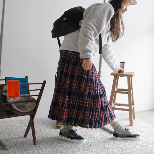 (コーディネートアイテム) フィールドキャップ #THE NORTH FACE PURPLE LABELフリースプルオーバー #patagonia、オレンジのハイネック #kha:ki、チェックのロングスカート #Rockmount、バックパック #karrimor、コンビカラー スニーカー #Vans