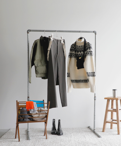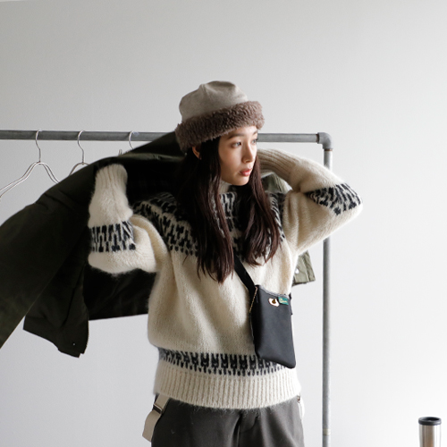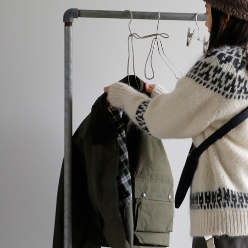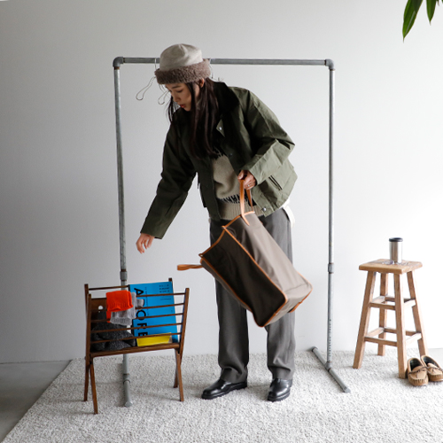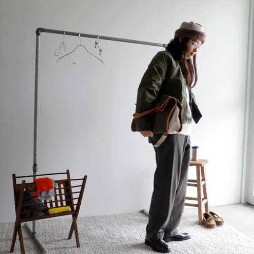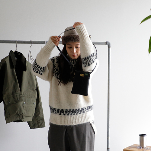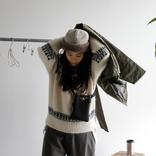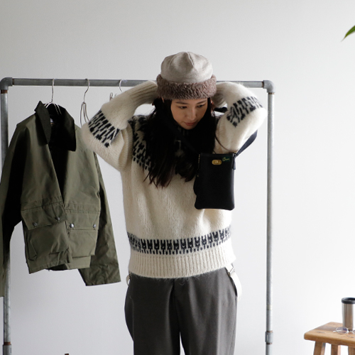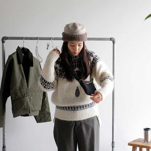 (コーディネートアイテム) ボアキャップ #mature ha、モヘアノルディックセーター #BATONER、サスペンダーパンツ #NIGEL CABOURN、ショートハンティングコート #Warker and Hawkes、メタルフレームグラス #Ciqi、スクエアトート #SOPO、ミニショルダーバッグ #Brady