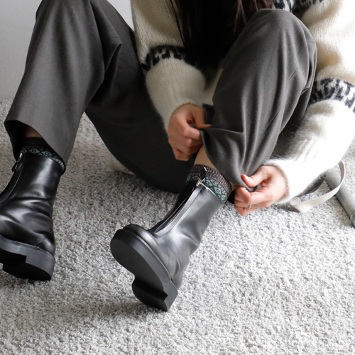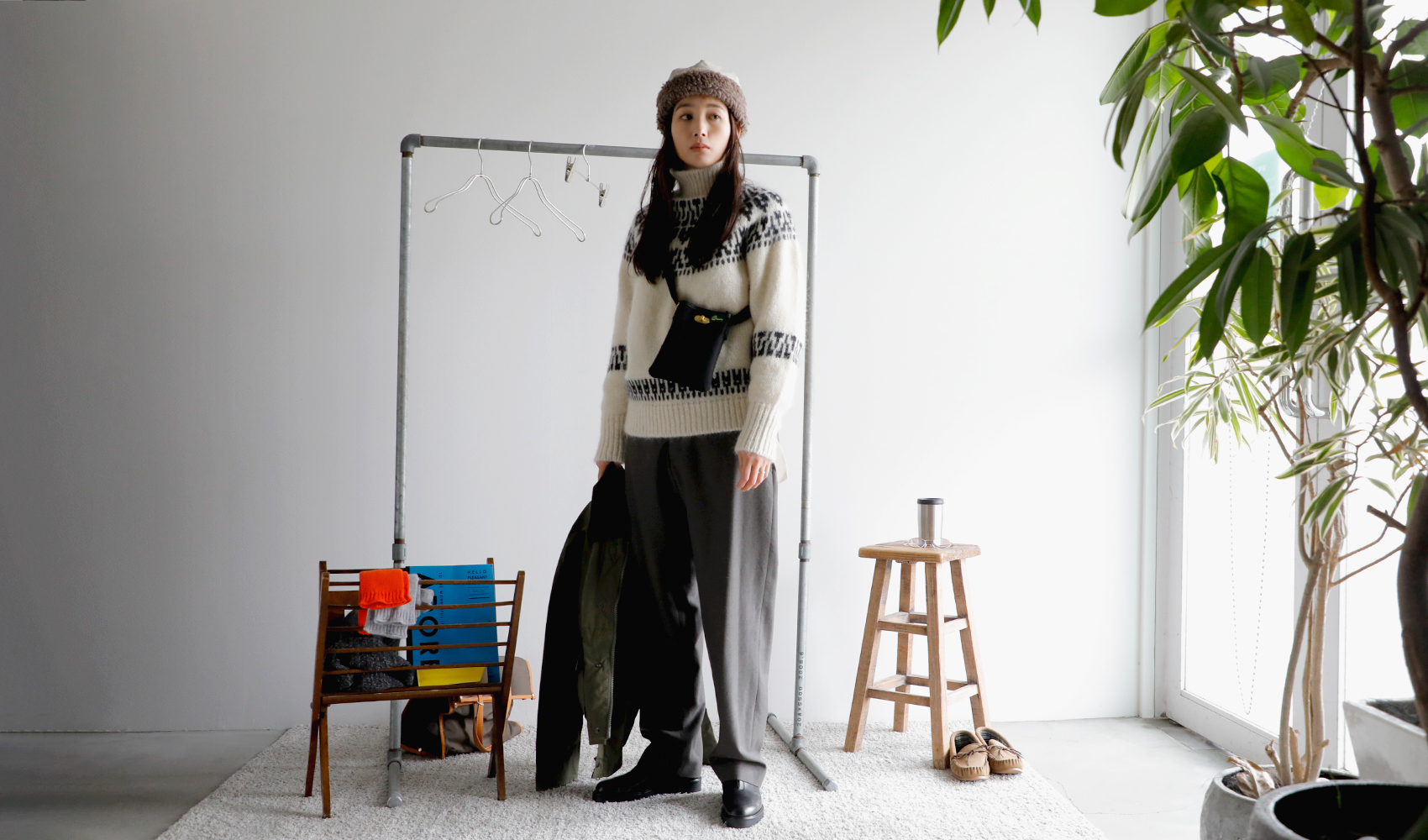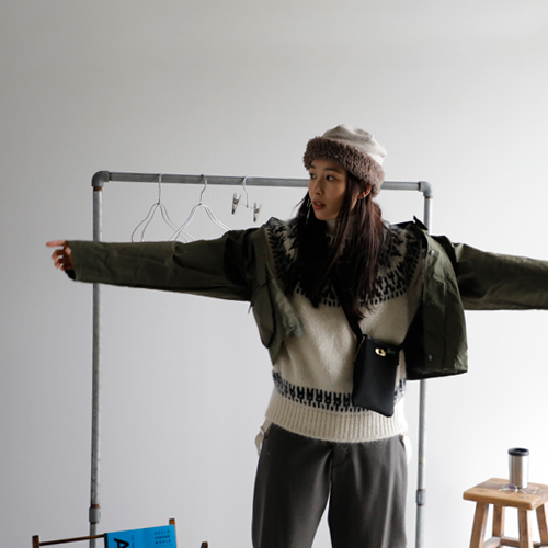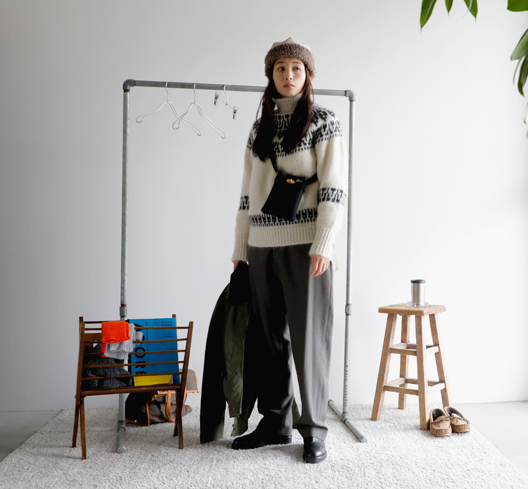 バトナーのノルディック柄のセーターなら、クリスマスムードな街並みにぴったり。ナイジェルケーボンのサスペンダーパンツとショートブーツで少しマニッシュに引き締めて、マチュアのボアキャップで少し抜け感もプラス。ウォーカーアンドホークスのハンティングコートは、ショート丈だから脱着も楽々で、室内への出入りが多くても安心です。きっと荷物が増えるから大き目のトートバッグを持って。財布とスマホはブレディのミニショルダーに入れておけば買い物もスムーズ!