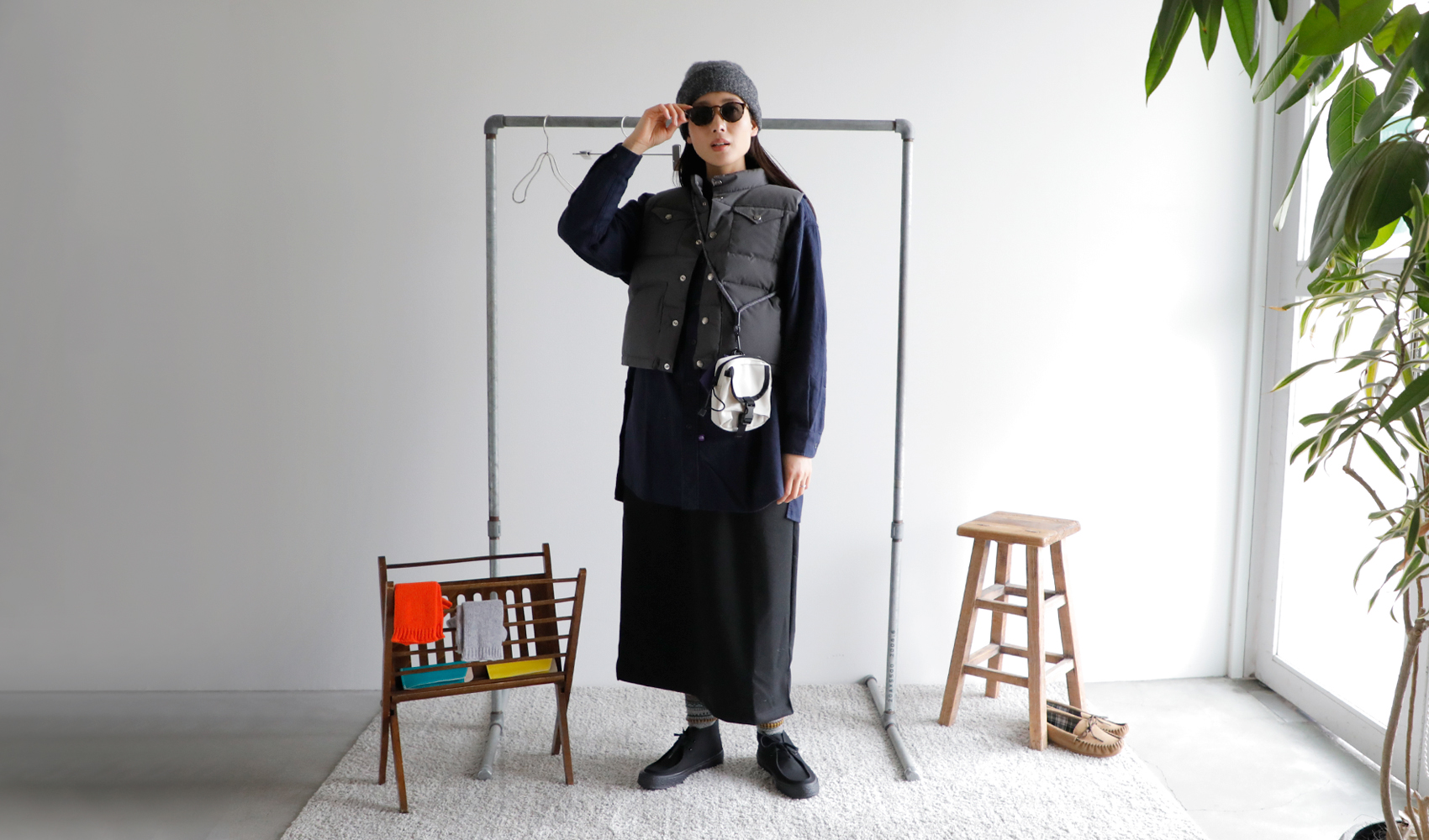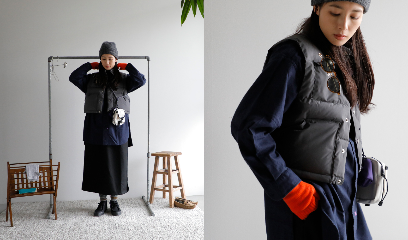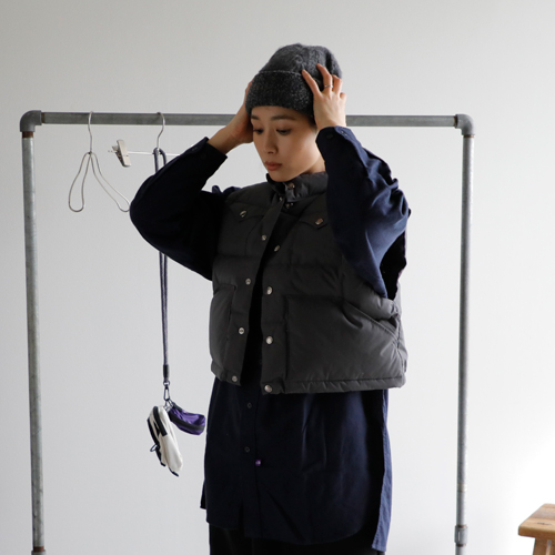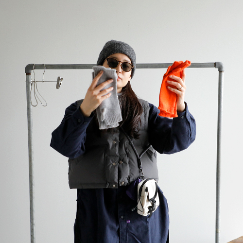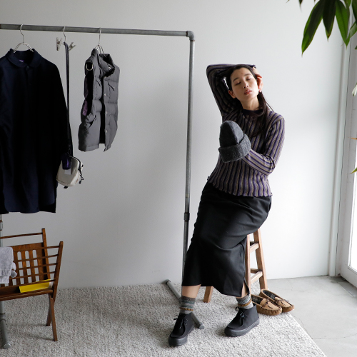 (コーディネートアイテム) ニットキャップ #Nine Tailor、ショートシエラベスト #THE NORTH FACE PURPLE LABEL、ストライプニット #Johnbull、フランネルロングシャツ #THE NORTH FACE PURPLE LABEL、ポーチバッグ #THE NORTH FACE PURPLE LABEL、アームウォーマー(オレンジ・グレー両方) #WILLIAM BRUNTON、サングラス #Ciqi、柄ソックス #rasox、キャンバスワラビーシューズ #Moonstar