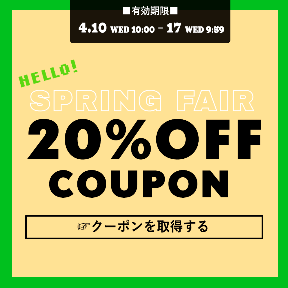 SPRING FAIRを開催いたします。バイヤーが厳選した、この春のおすすめアイテムがクーポン利用で20%OFFに。対象は約200アイテム。今シーズンの新作アイテムから、普段セールにかけないベーシックなアイテムまで幅広いラインナップになっています。見逃し厳禁!このお得な機会に、春のお気に入りをつかまえてくださいね。