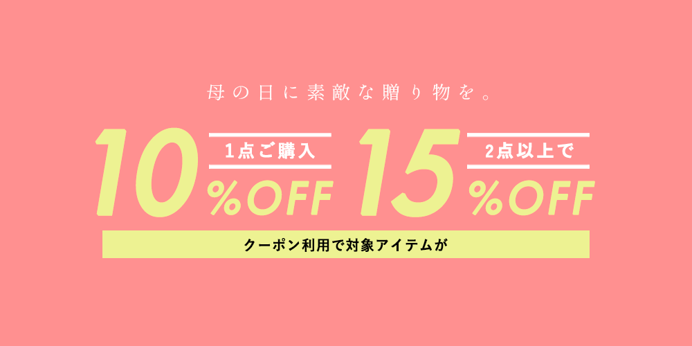 4月も後半戦、今年の母の日は5月12日とどちらも一か月を切りましたね。ピウでは心地の良いトップス、日傘や靴下などこれからの時期に活躍間違いなしの小物もたくさん入荷中。いまこそ母の日ギフト選びにはぴったりのタイミング!ということで1点10%OFF、2点以上で15%OFFのクーポン企画を開催いたします。