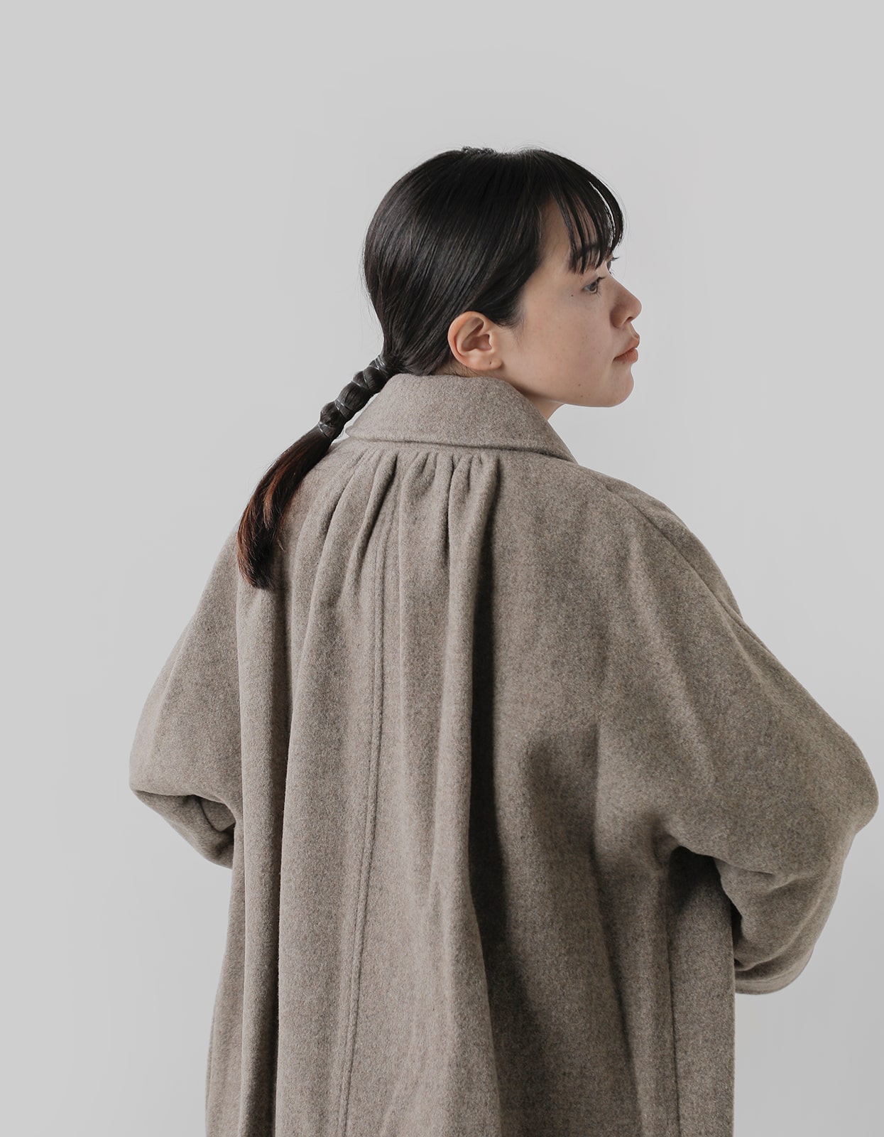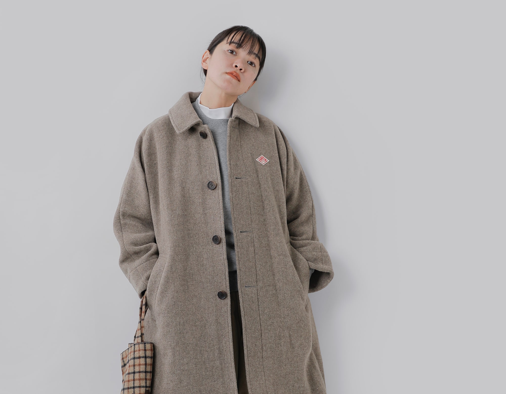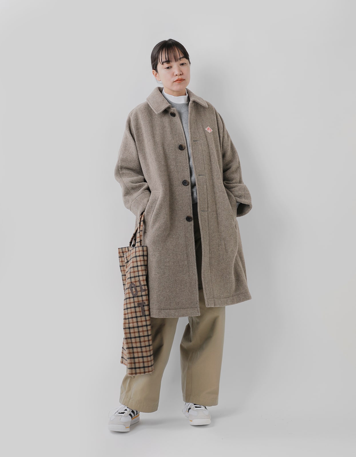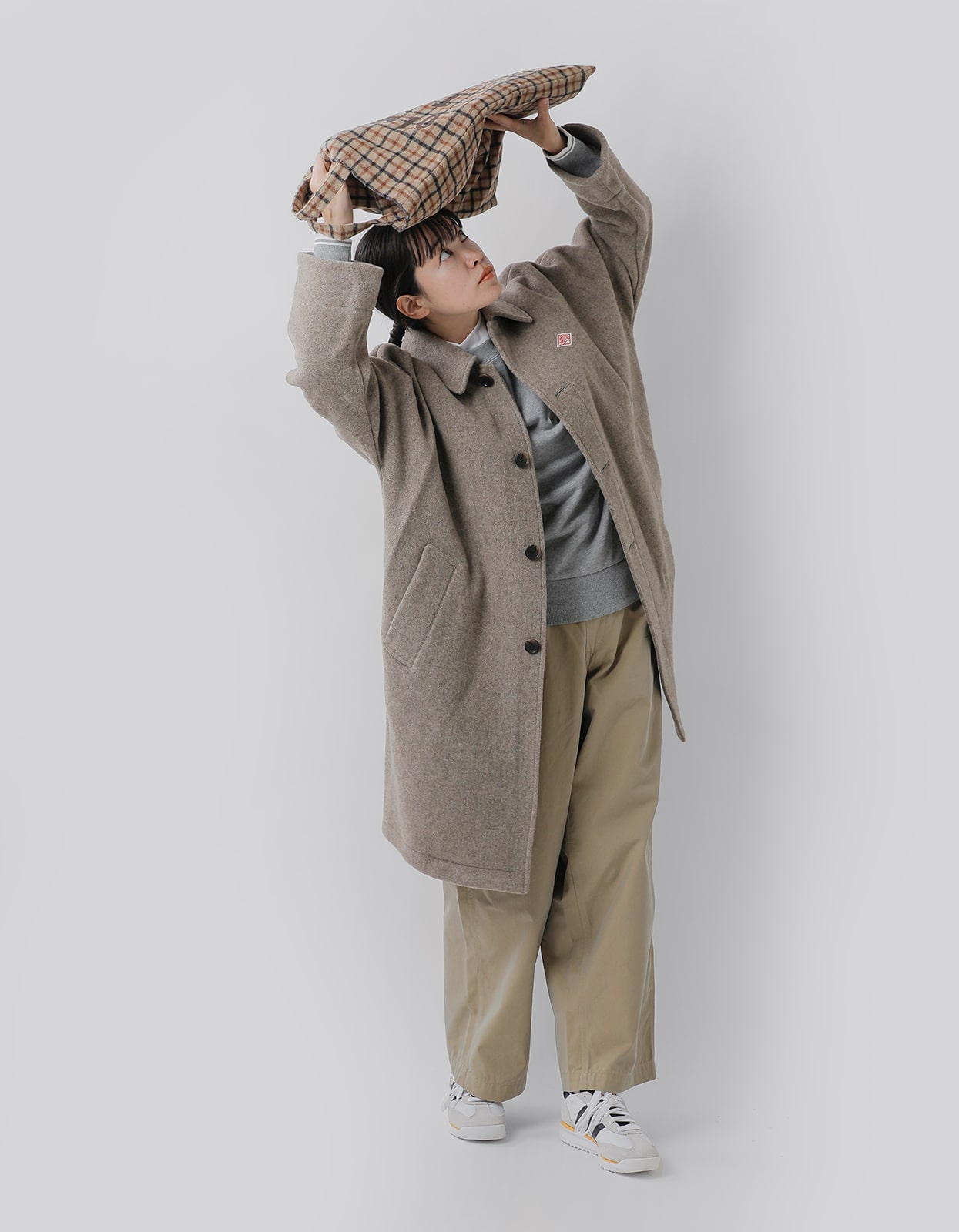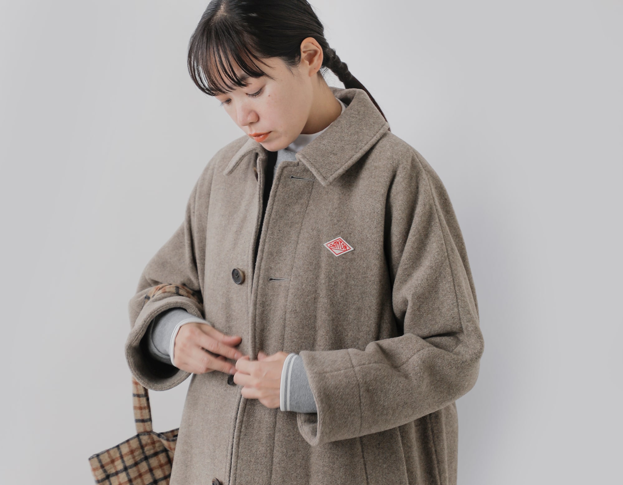 リラックス感のあるシルエットで楽な着心地がありながらも、こなれ感を演出するDANTONダントンのドルマン袖のロングコート。バックのギャザーが印象的。ウールパイルよりも糸番手を細くして軽やかで着心地に優れた仕上がりです。重たくなりがちな冬のロングコートですが、軽やかに着られるこちらの一枚で、寒い季節のおでかけも心躍りますね。