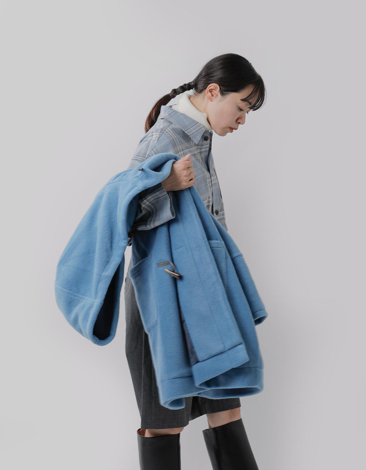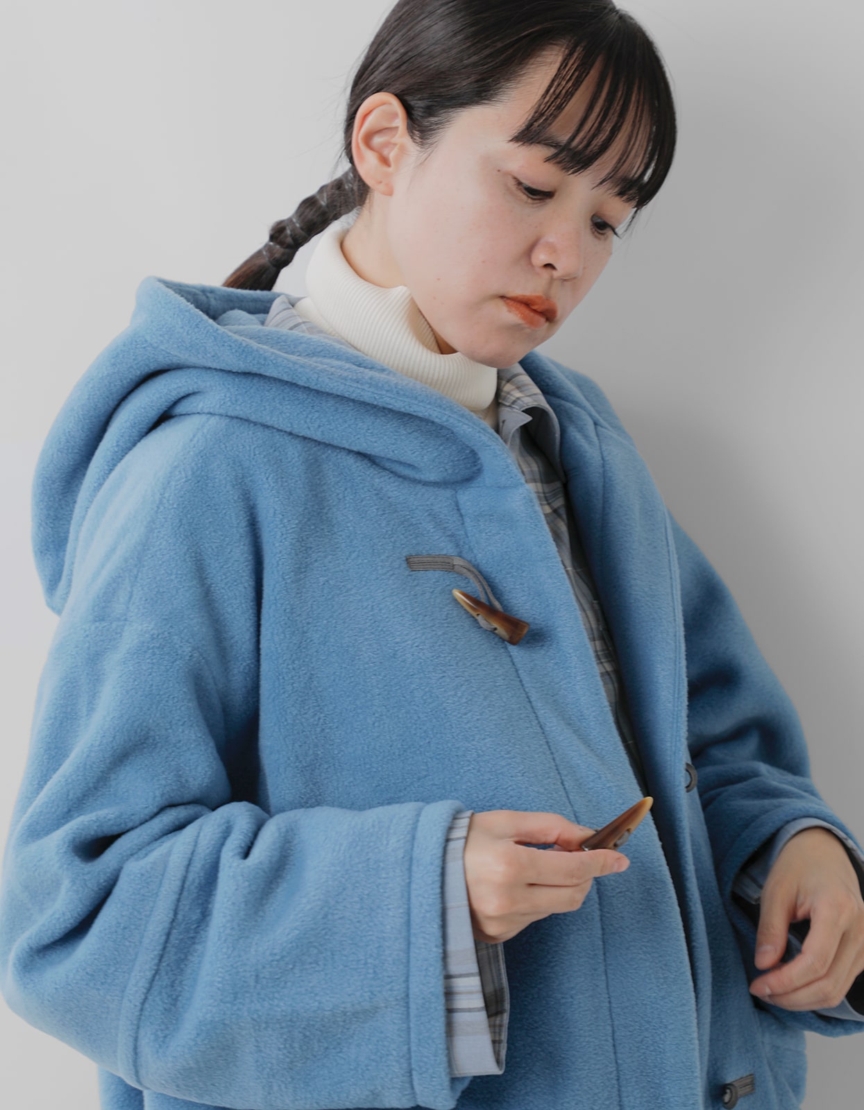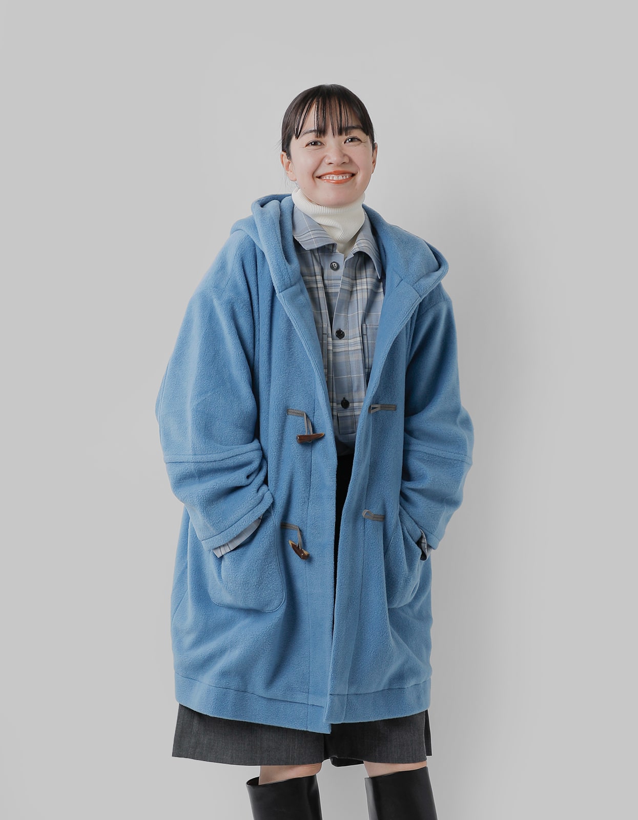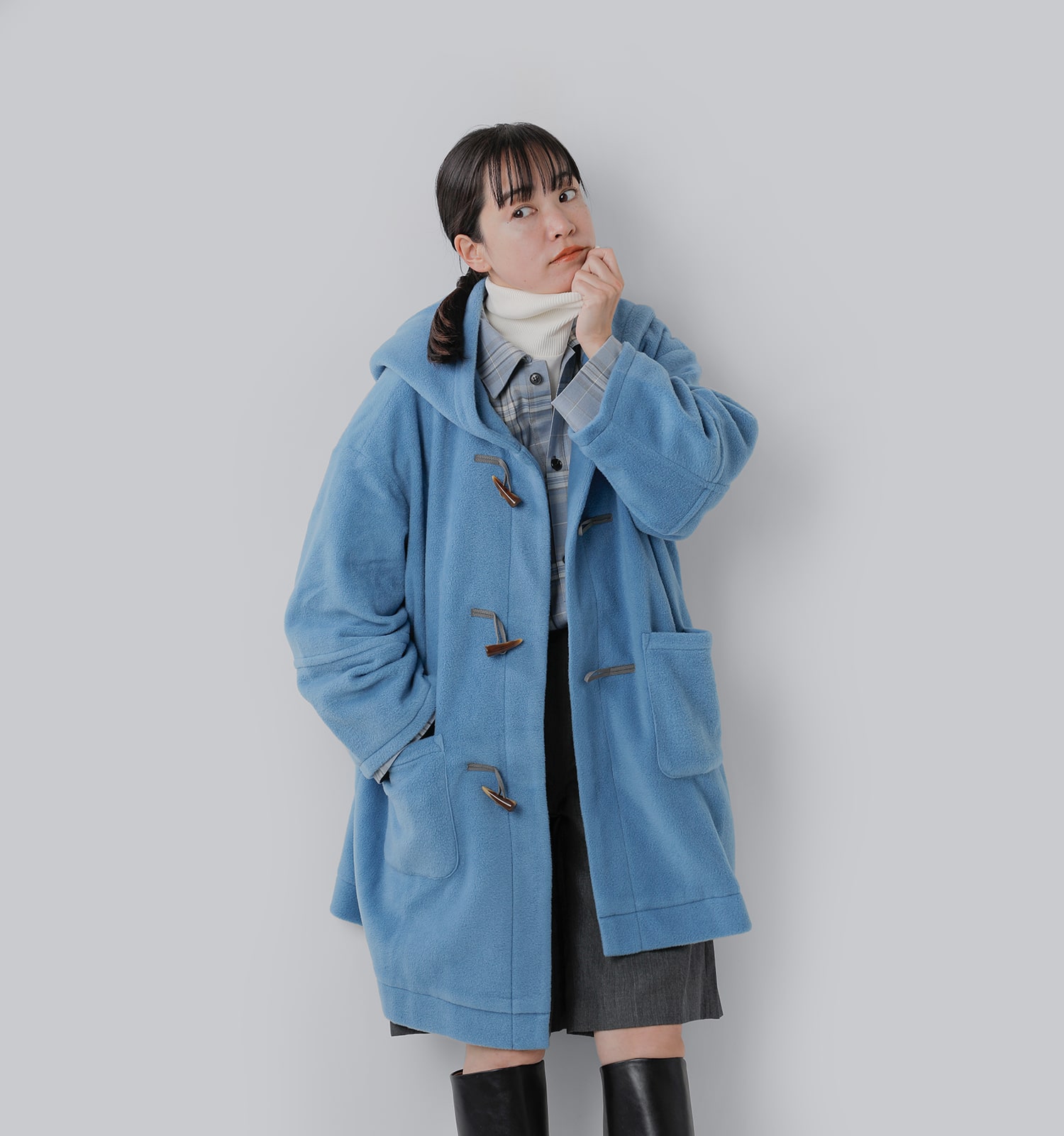 鮮やかなカラーのアウターで華やかにまとめるkelenケレンのLIZZIE。 フリース素材でダッフルの形が柔らかな印象だからこそ、この色味でも派手にならずに着用できる1枚です。肩を落とした抜け感のあるシルエットでオーバーサイズなのでどんなアイテムとも合わせやすいコートです。