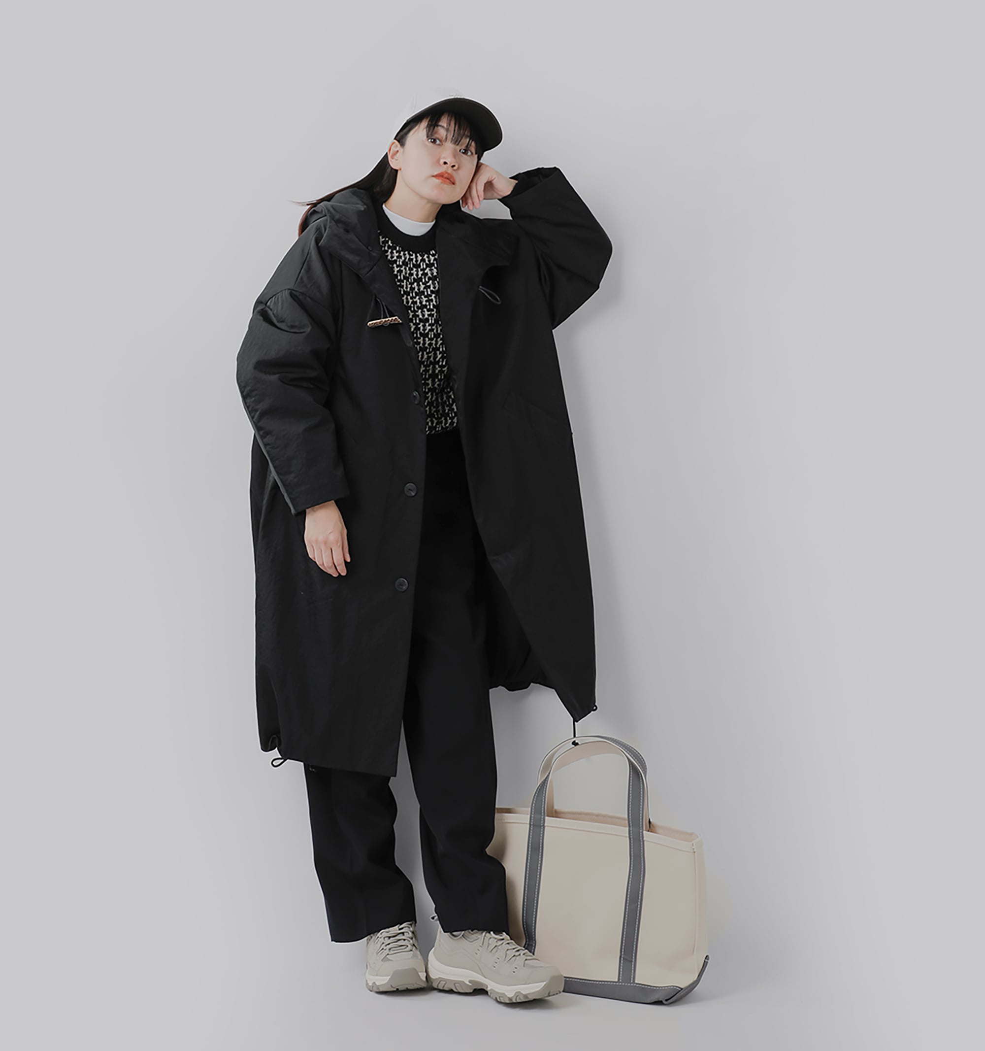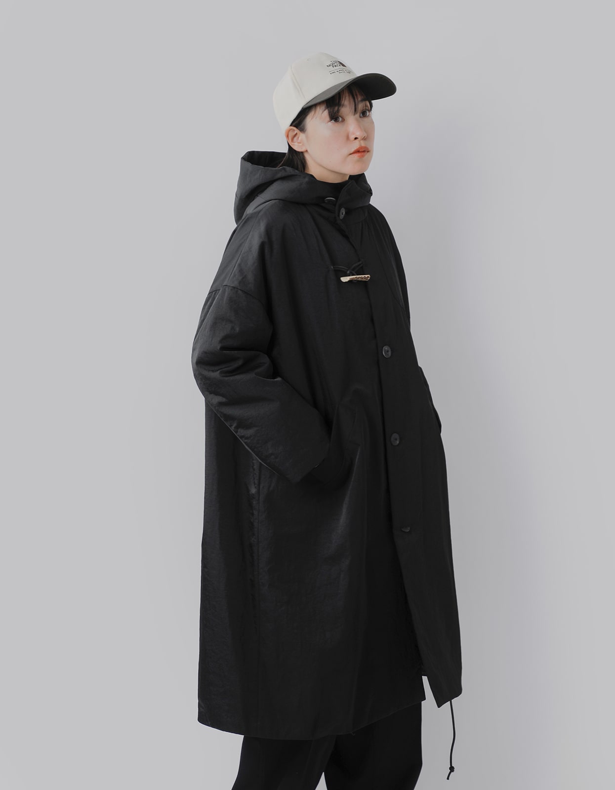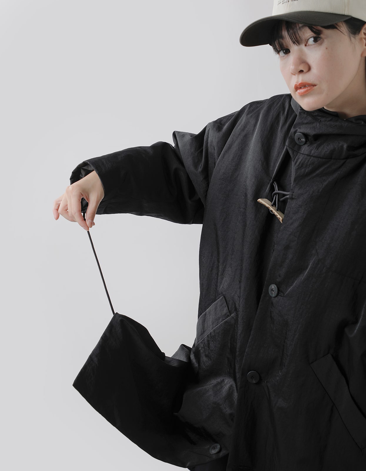 ゆったりとした落ち感のあるシルエットのDulcamaraドゥルカマラのフードダッフルコート。長く着古したようなヴィンテージののような風合いで落ち着いた艶感もあります。裾に、裾のスピンドル紐を絞ることでカジュアルからエレガントな雰囲気にまで対応でき長く愛用していただける一着です。