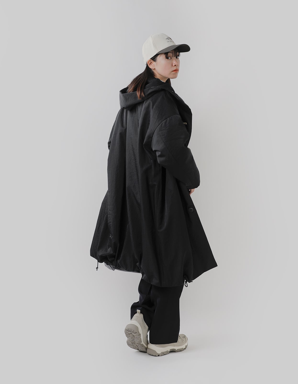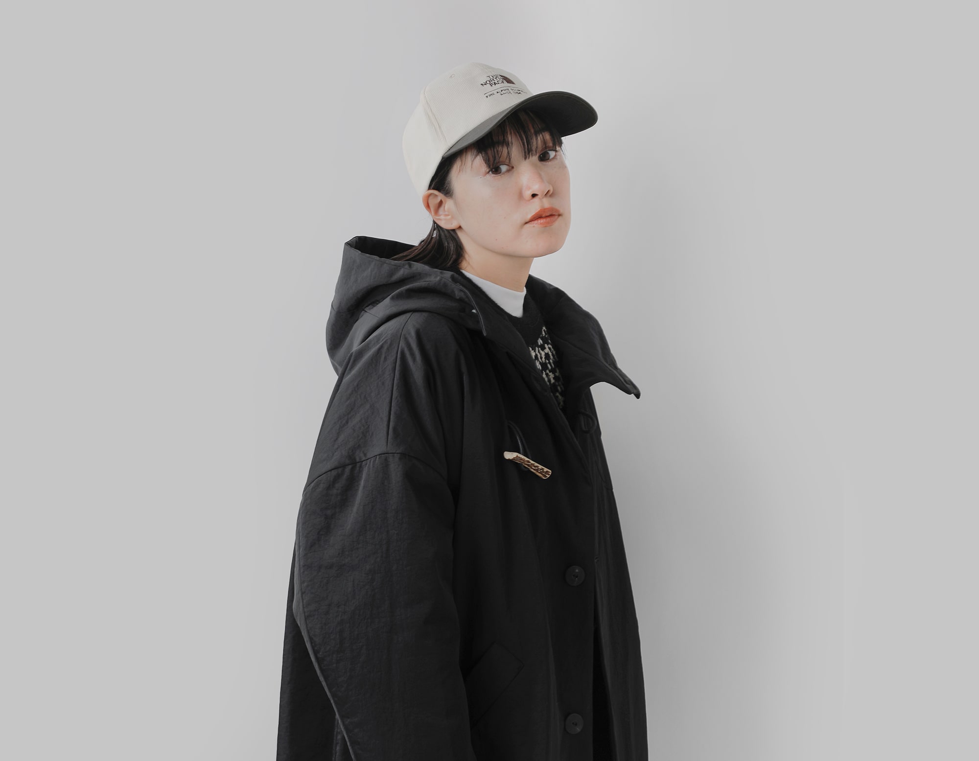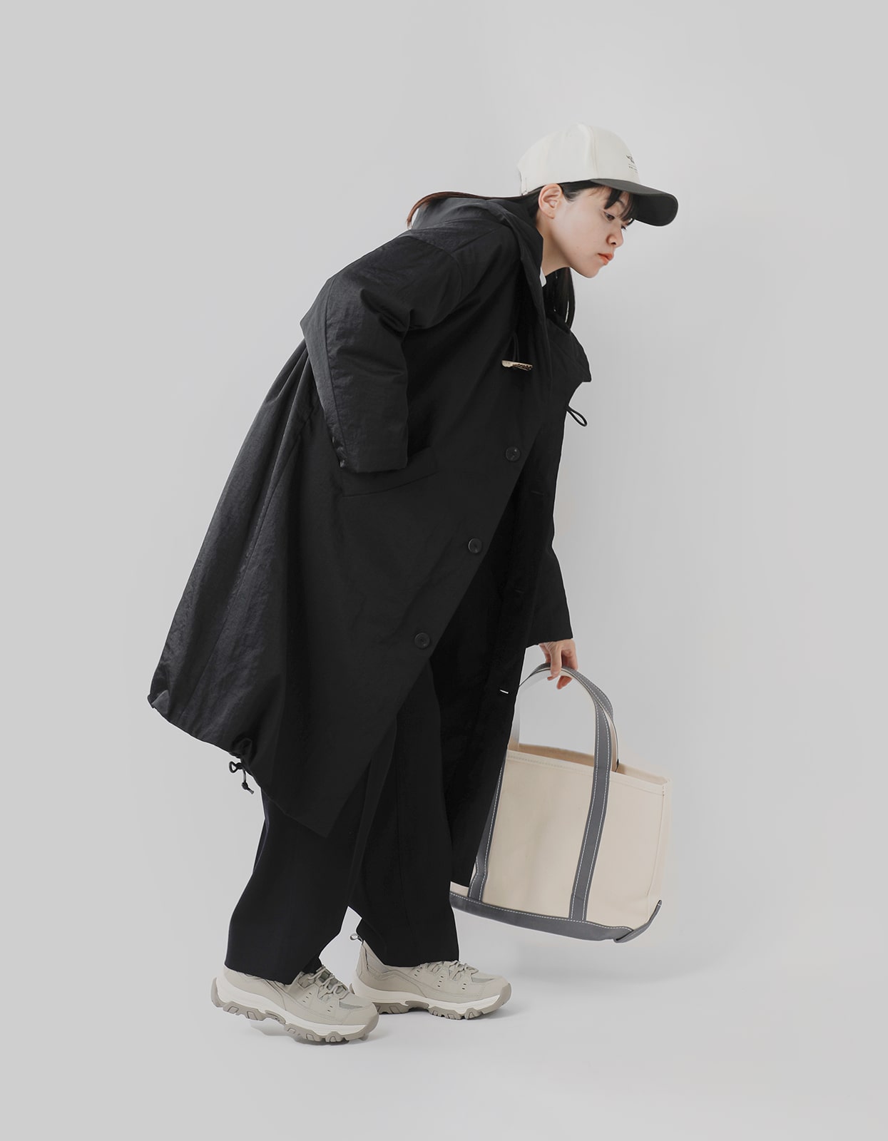 ゆったりとした落ち感のあるシルエットのDulcamaraドゥルカマラのフードダッフルコート。長く着古したようなヴィンテージののような風合いで落ち着いた艶感もあります。裾に、裾のスピンドル紐を絞ることでカジュアルからエレガントな雰囲気にまで対応でき長く愛用していただける一着です。