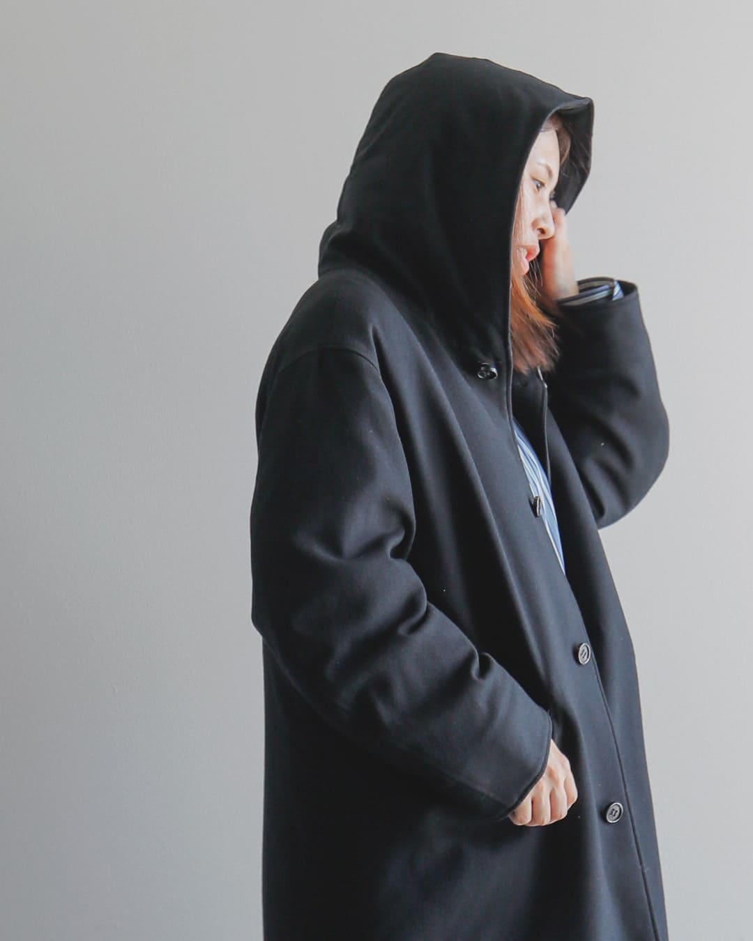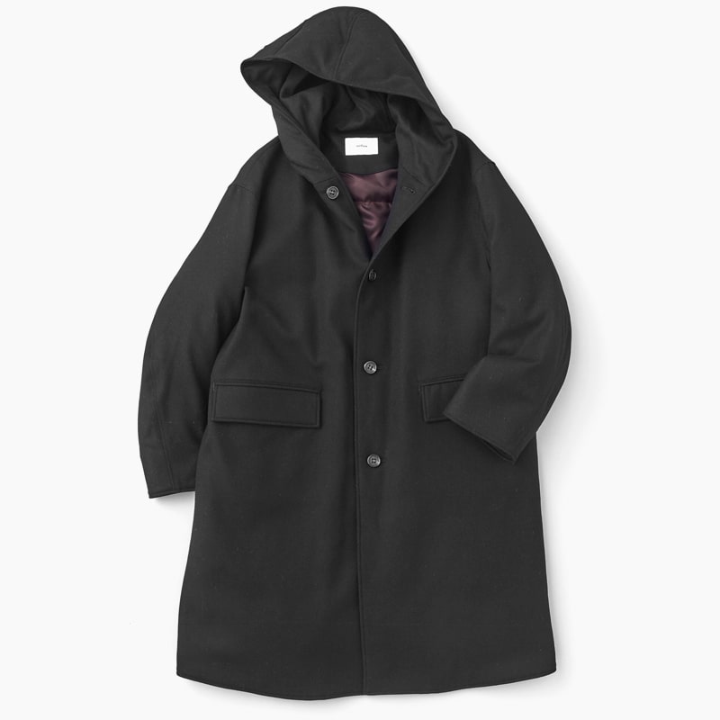 ノーカラーだと首回りが寂しいので、フード付きをチョイス。