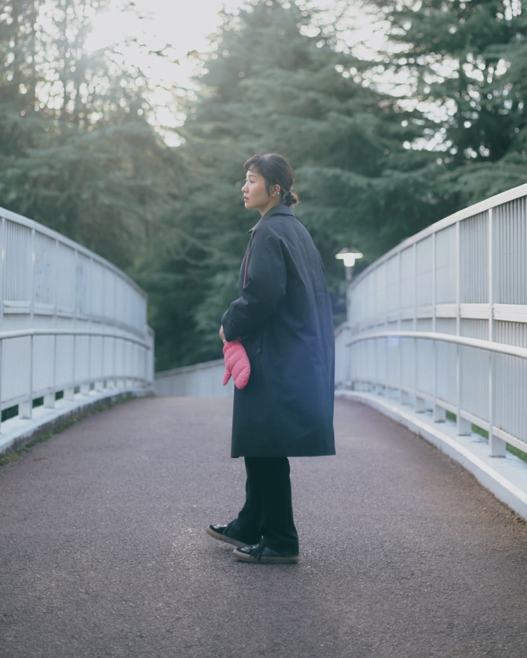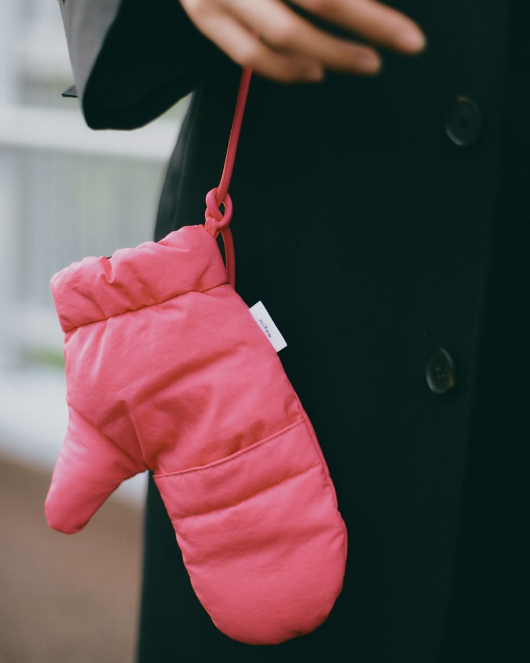 黒のステンカラーコートは大人っぽくシックに見えがちですが、わたしもミトンと合わせて可愛いさをプラスしました。