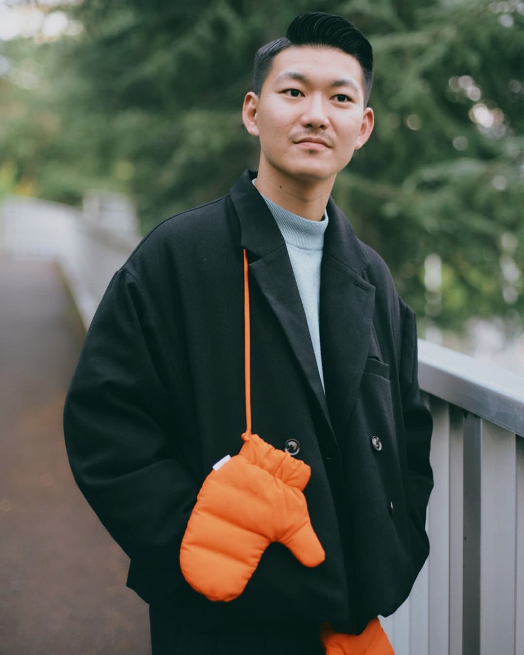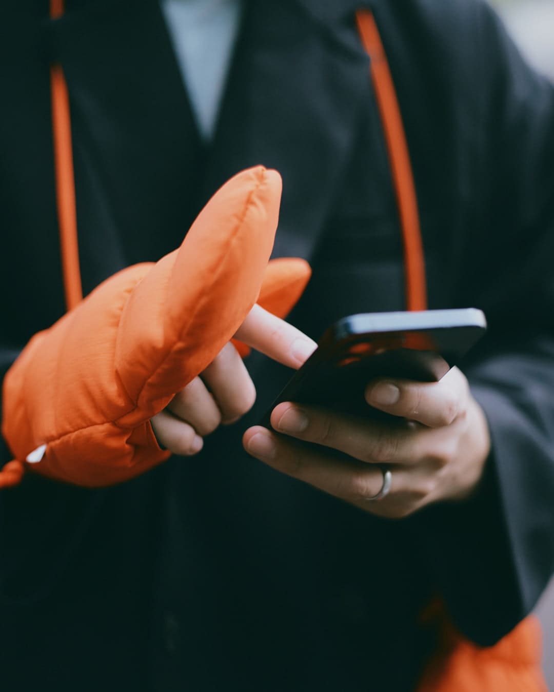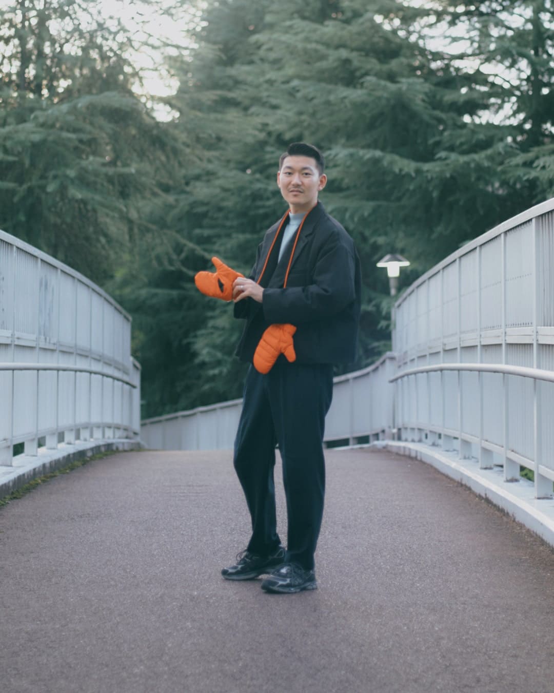 上下とも黒で大人っぽく合わせつつ、差し色にオレンジのミトンと補色であるブルーをインナーに持ってきました。