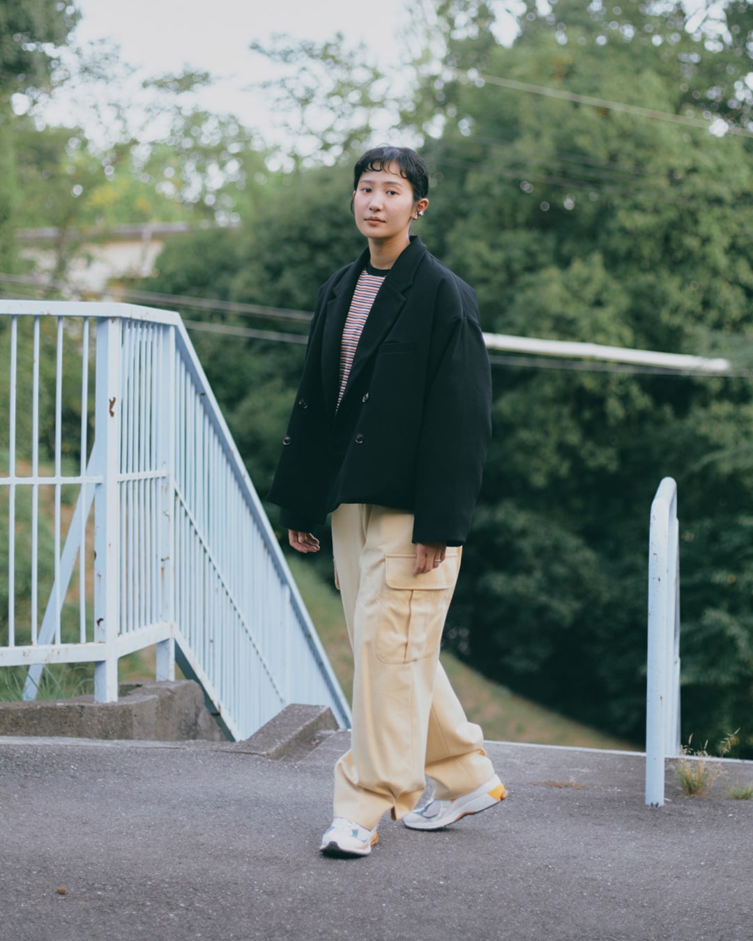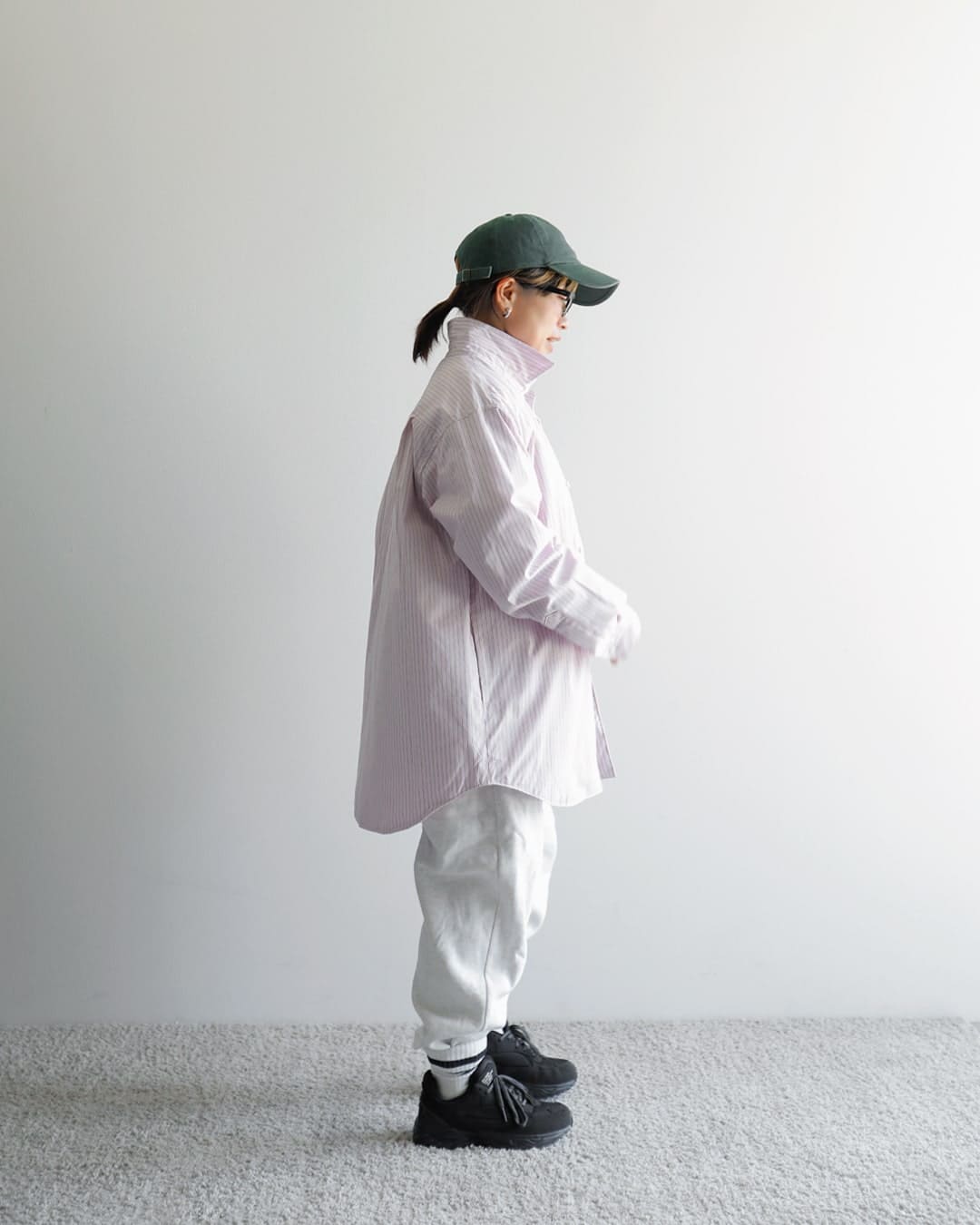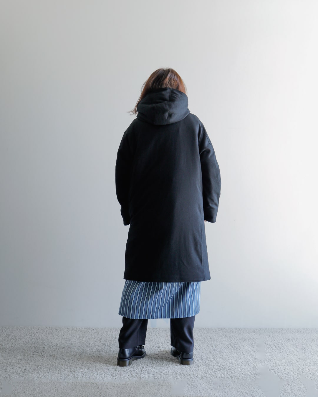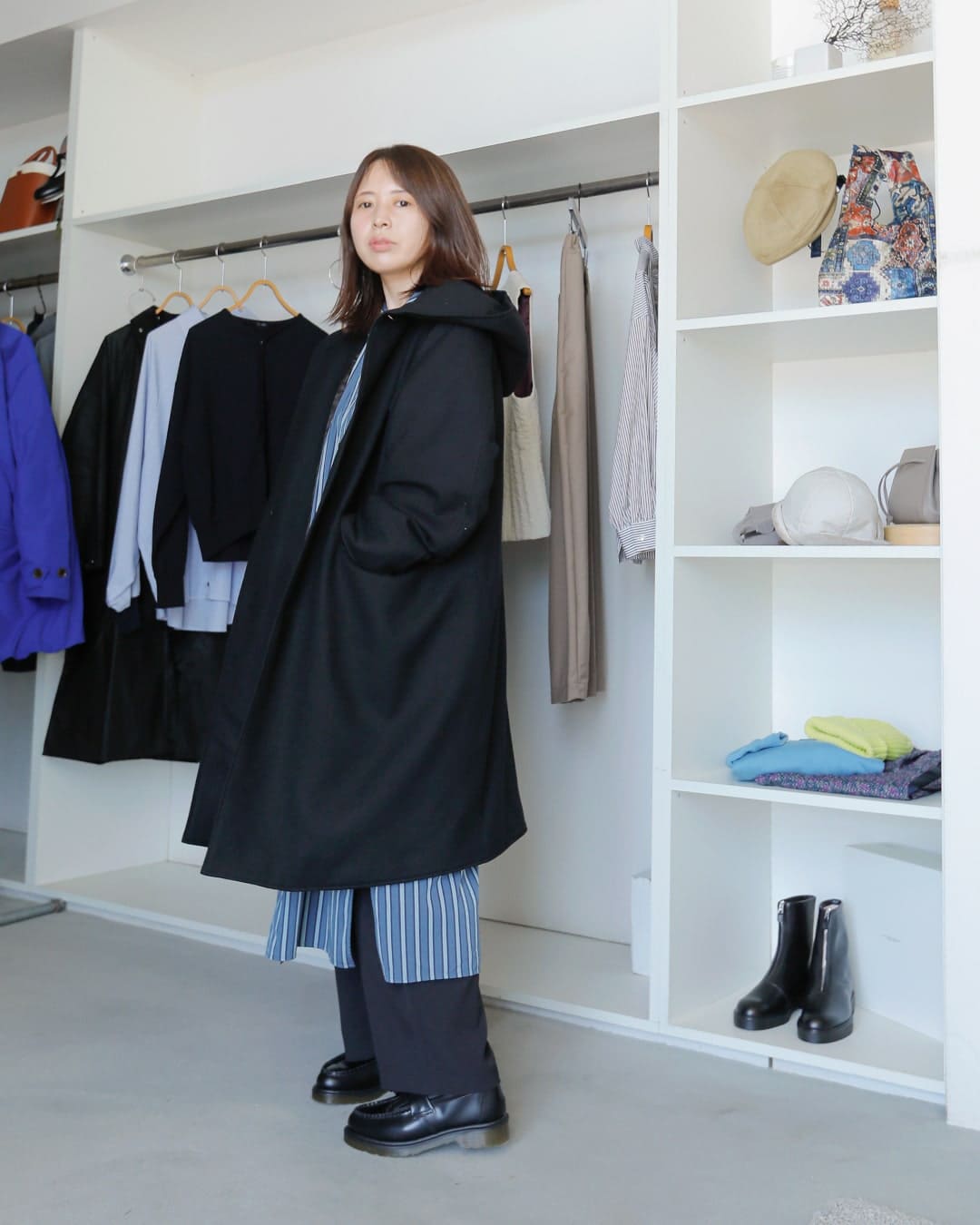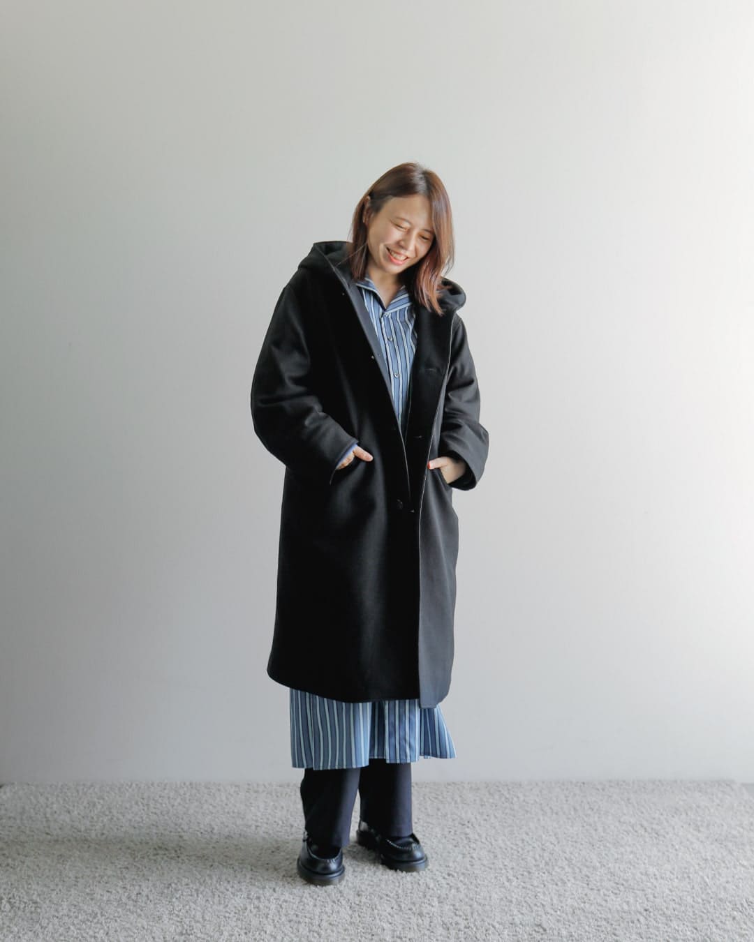 ゆったりとしたワンピースに、太めのパンツにごつめのシューズ。小柄だけど、意外にバランスよく着用できるこのスタイルが最近好きで、それに合わせてみました。中は、ロング丈でもすっきりみえるよう、ストライプを合わせています。