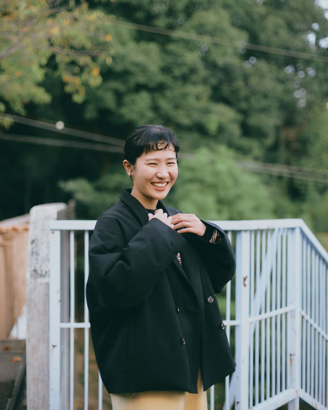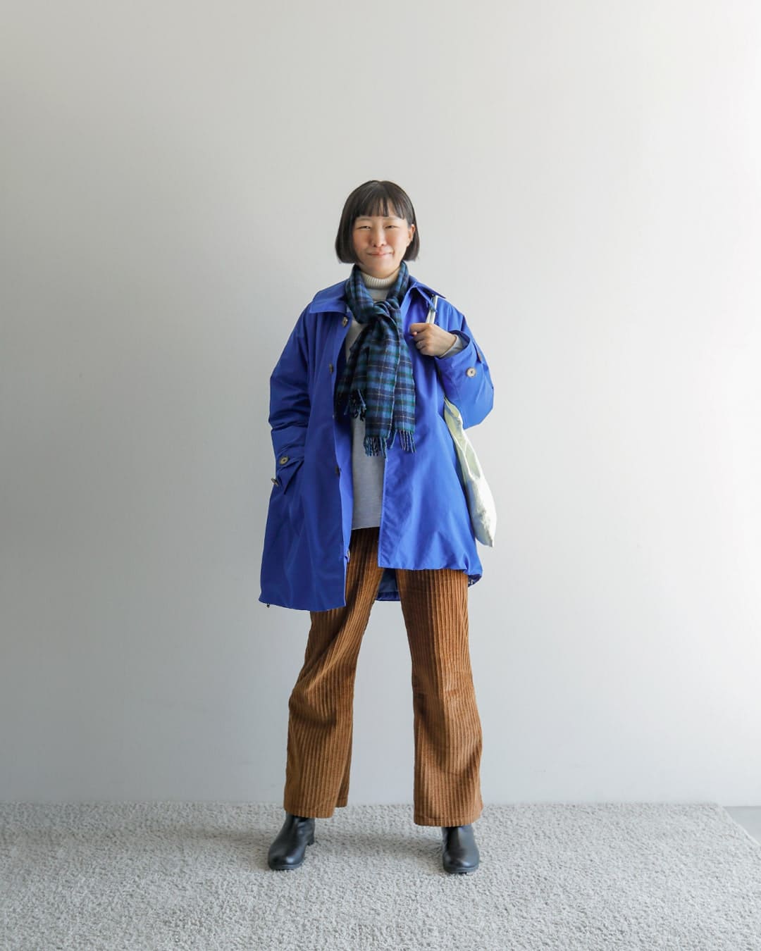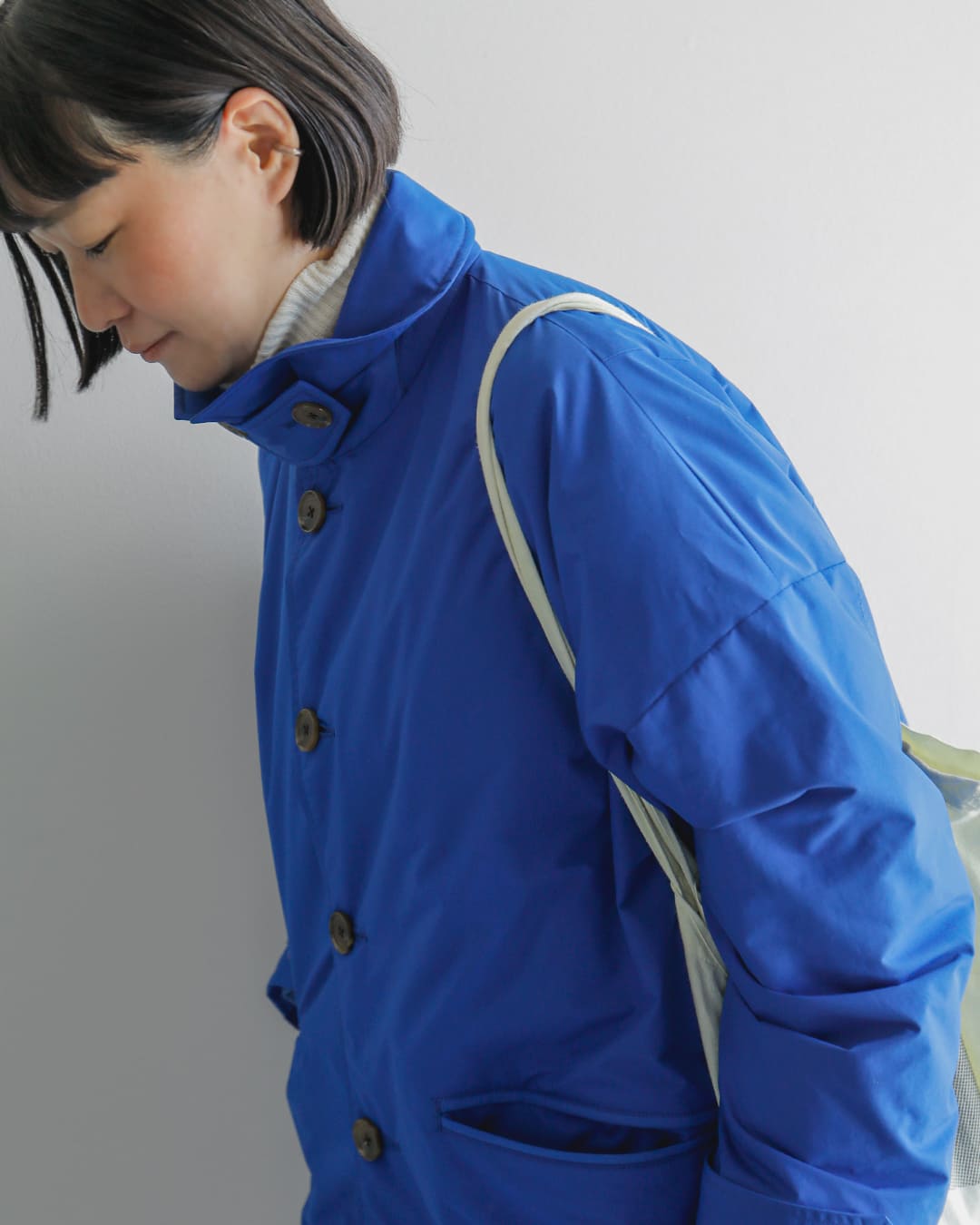 青のアウターなんて初めてですが着るととってもかわいい!普段ベーシックなカラーを選びがちなので、意外となんにでも合わせやすいのではと思いました。