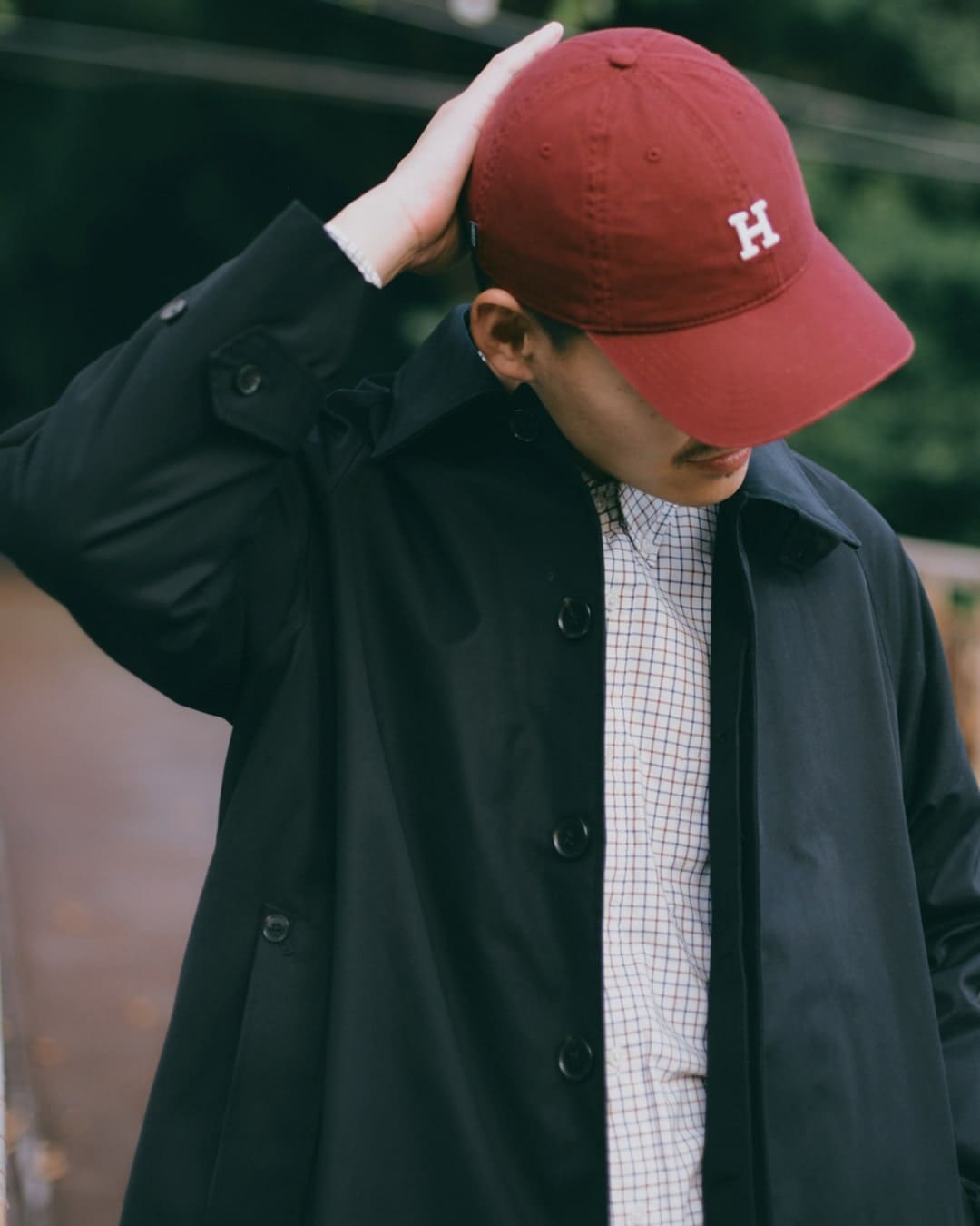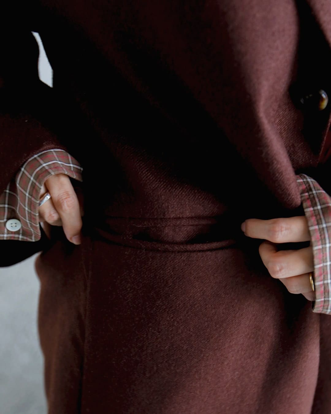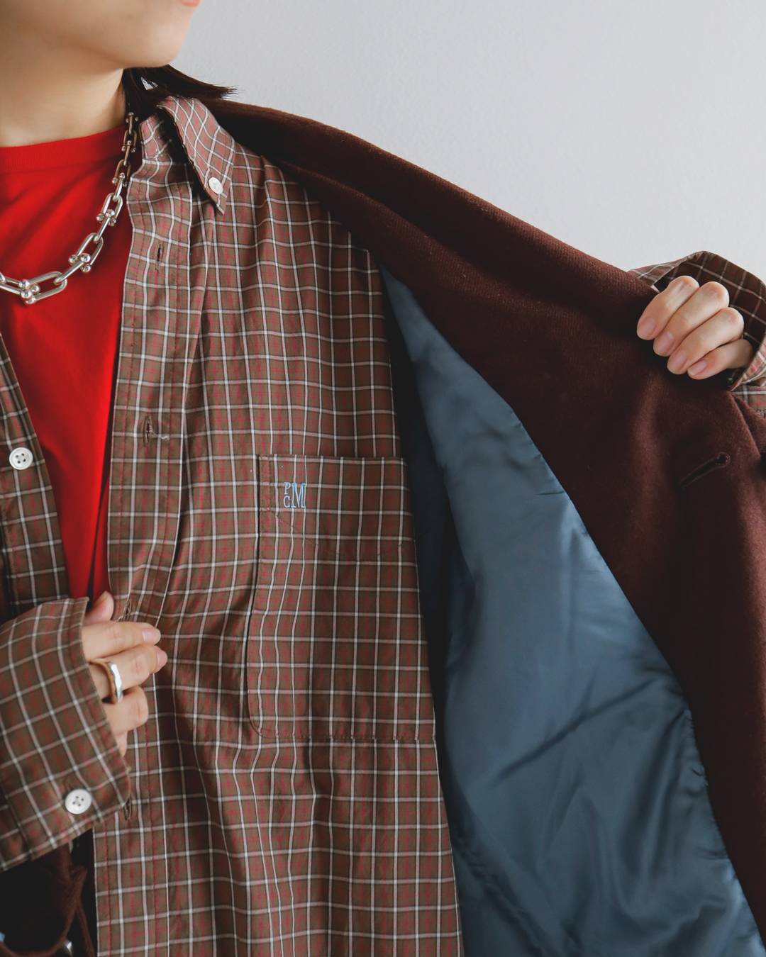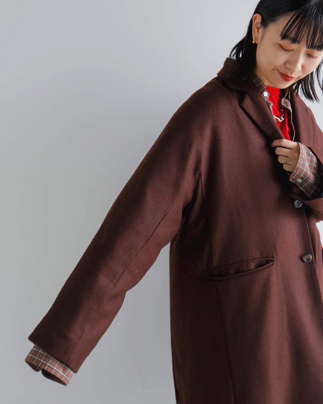 途中からはチェックのシャツを間にはさみ、レイヤードスタイルにアレンジ。全体的にウォーム感あるカラーでまとめています。