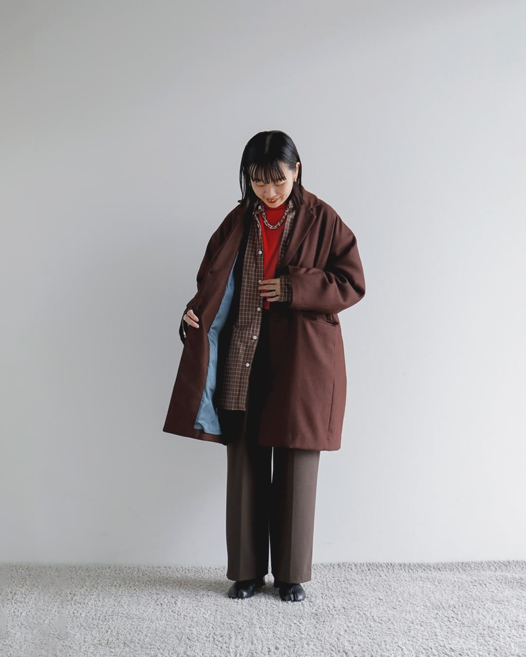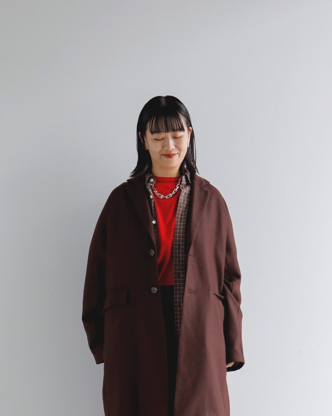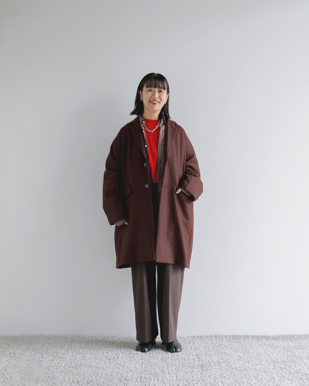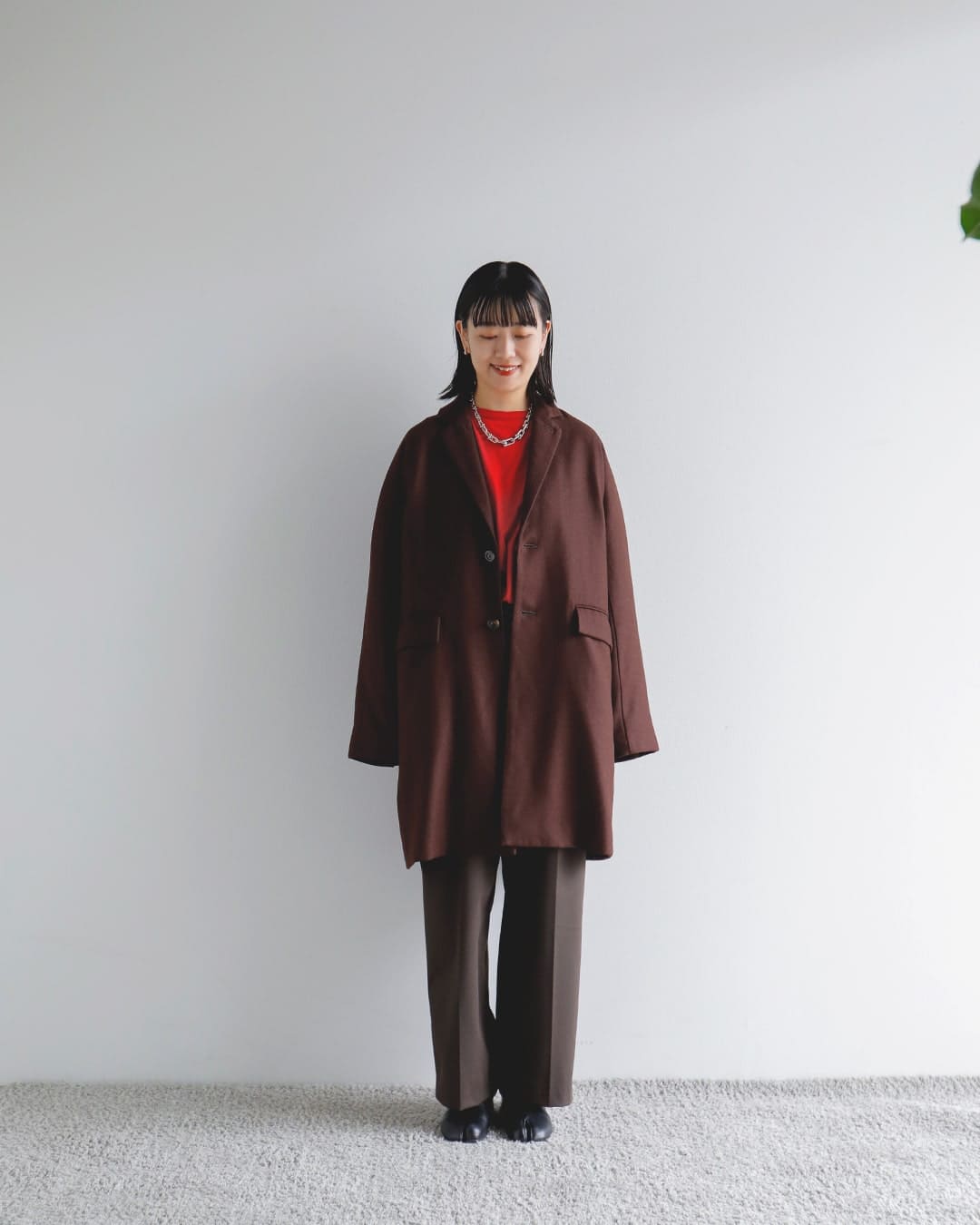 BROWNでのワントーンでまとめ、アクセント色にREDで差し色を足しています。シンプルですが、色のバランスや余白を持たせたスタイリングにしました。
