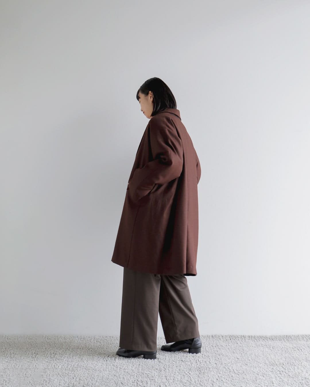 今季、赤身のあるBROWNカラーが気になっている事と、マニッシュな雰囲気のスタイリングに合わせたかったので。かしこまりすぎない絶妙な光沢感が気に入っています。