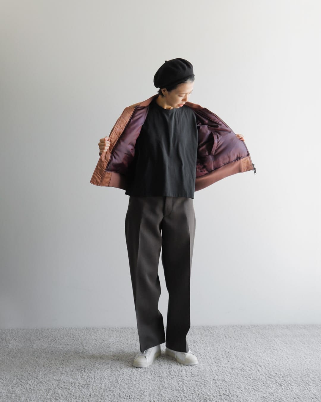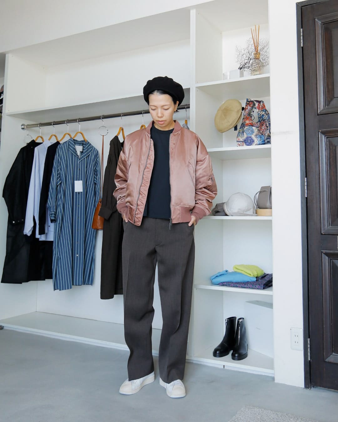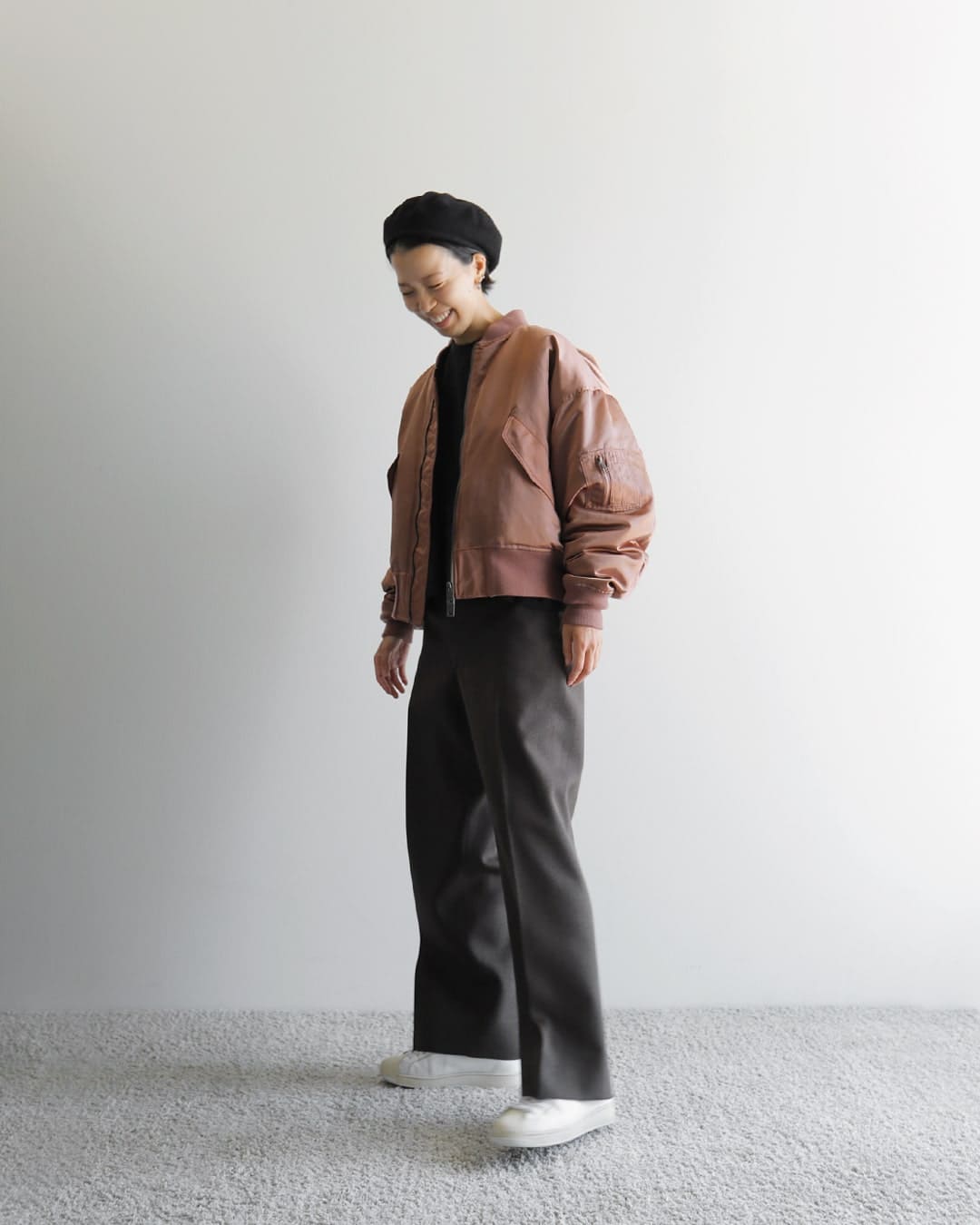 フライトジャケットが主役になるよう、他のアイテムはシンプルにすっきりまとめました。