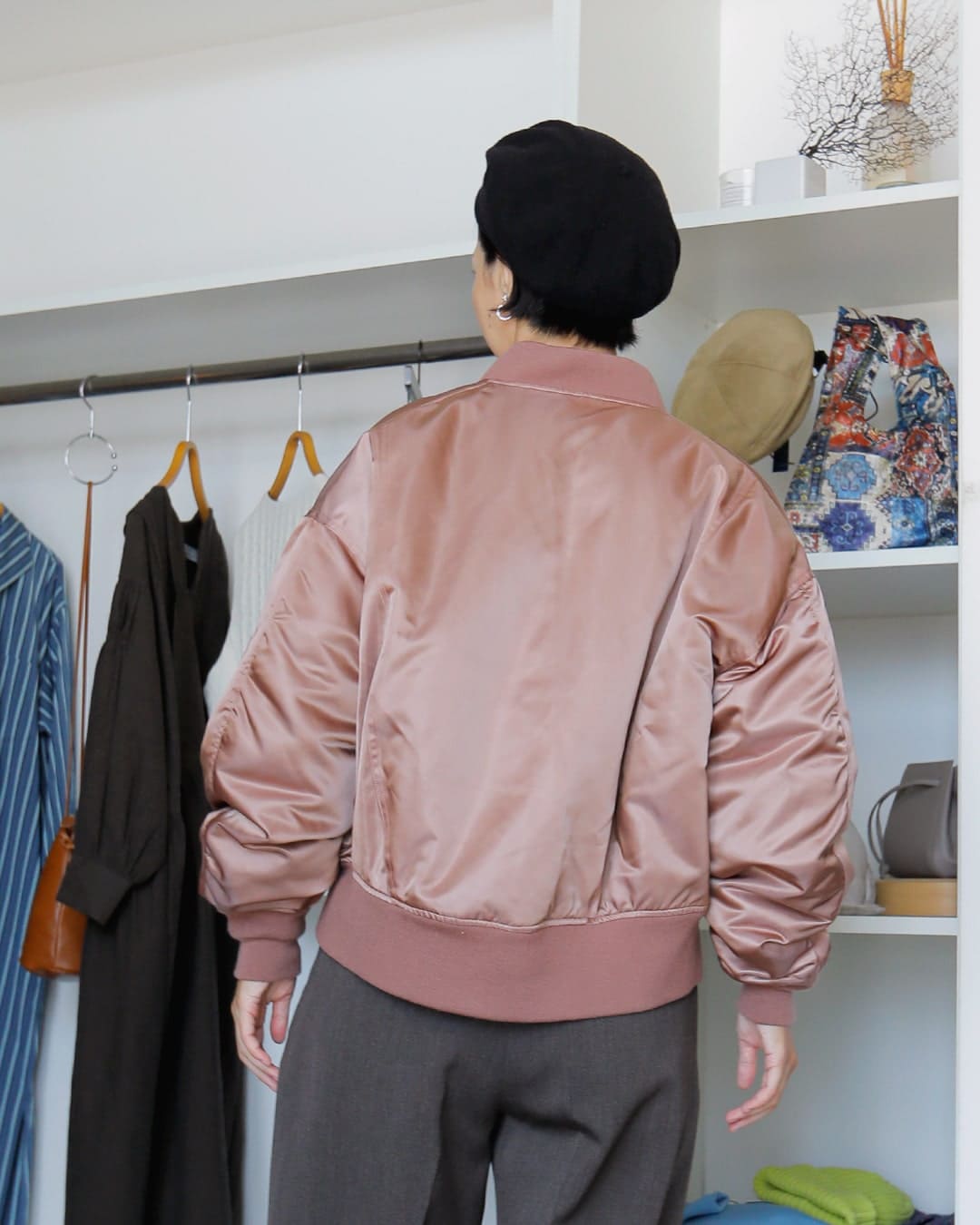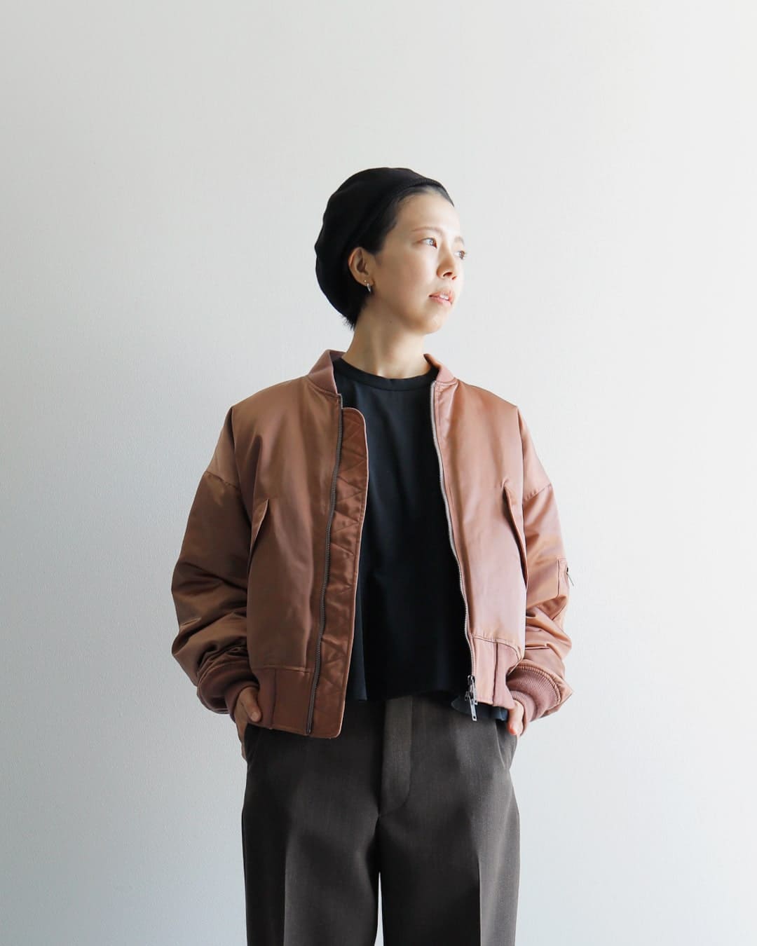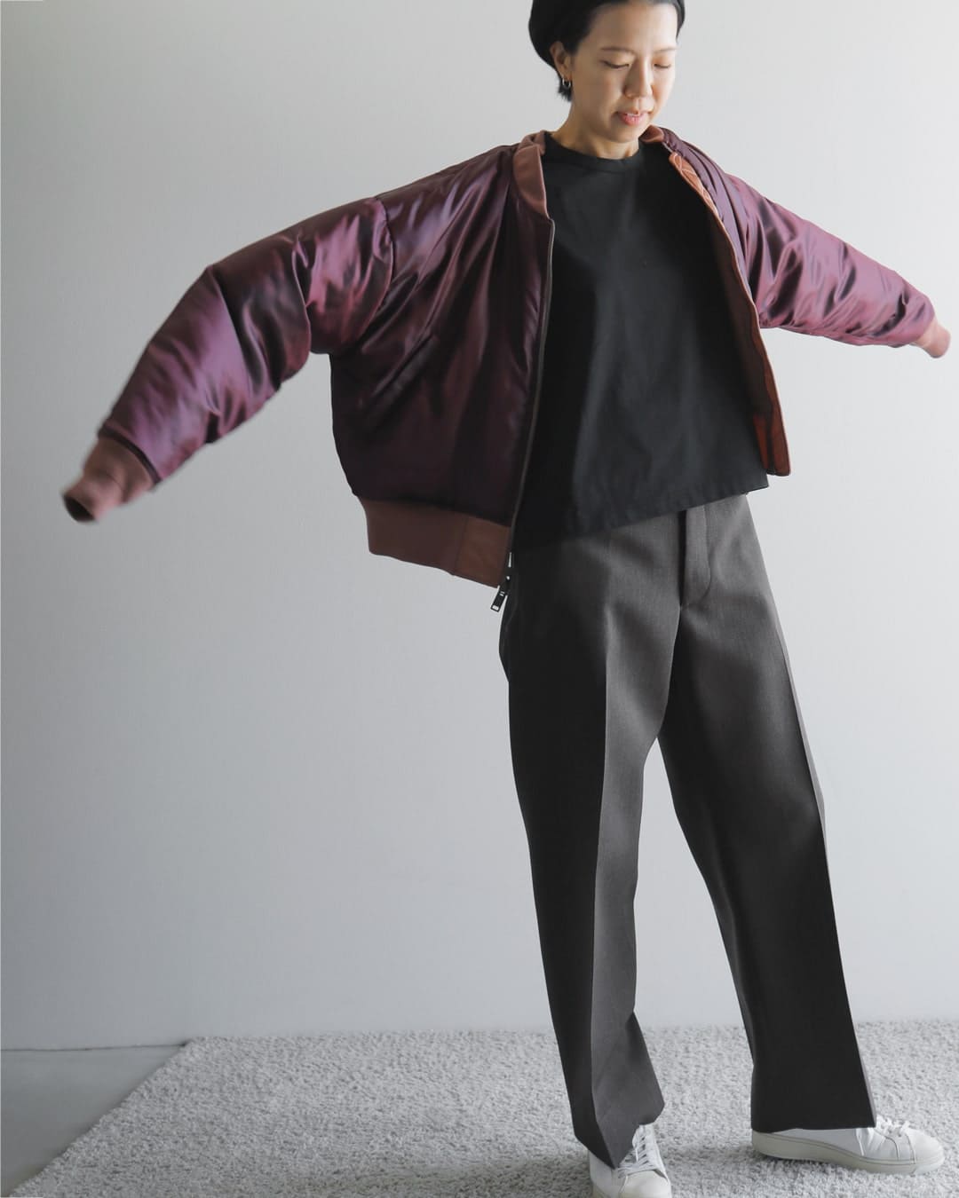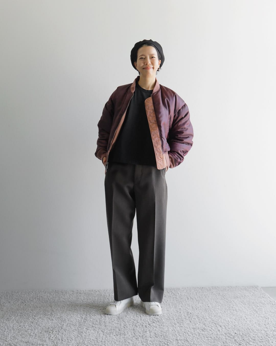 フライトジャケットが主役になるよう、他のアイテムはシンプルにすっきりまとめました。