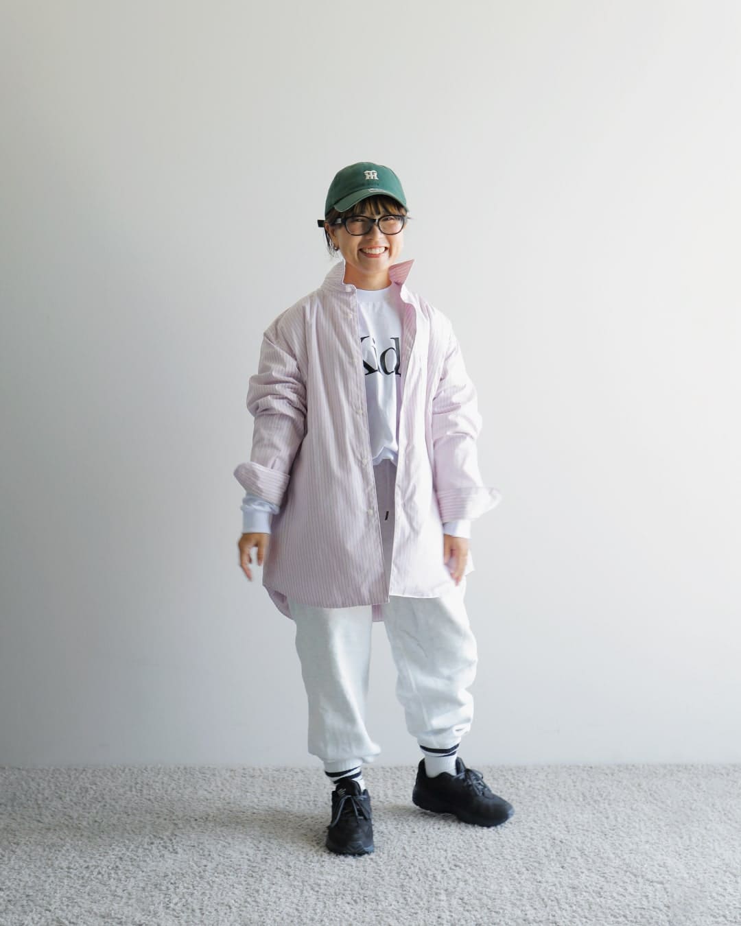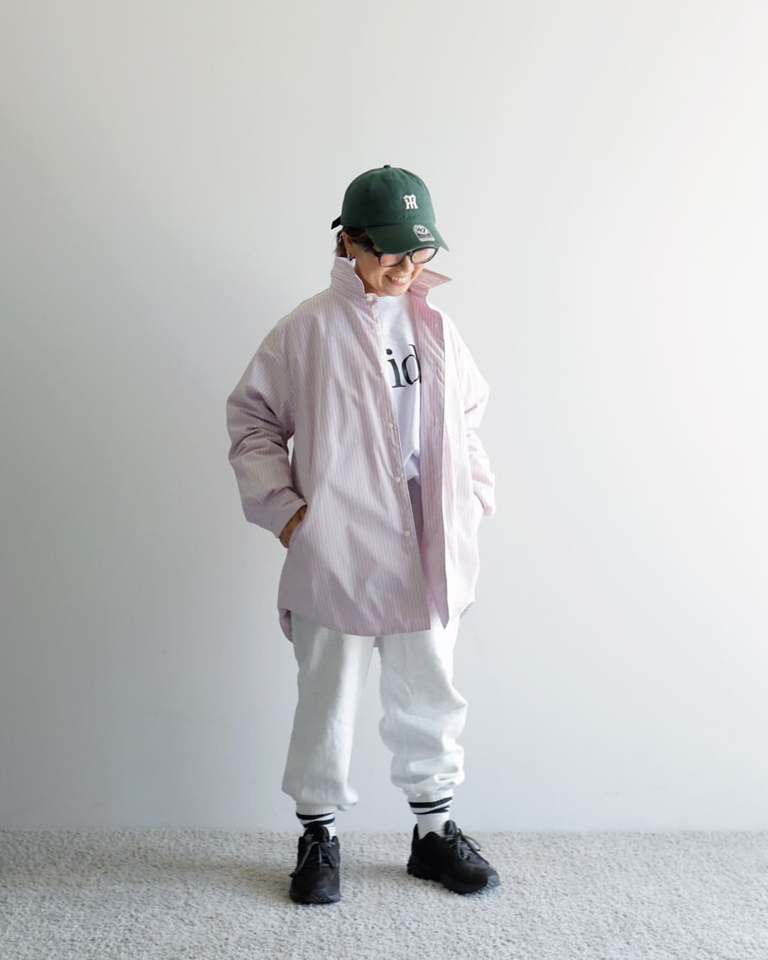 今回は息子の野球観戦をイメージしてみました。何かとミックスされたスタイルが好きなのですが、シャツのきっちりした感じにスウェットパンツを合わせた、お決まりのスポーツミックススタイルです。このスタイル、ダウンシャツなら長いシーズン楽しめていいですね。