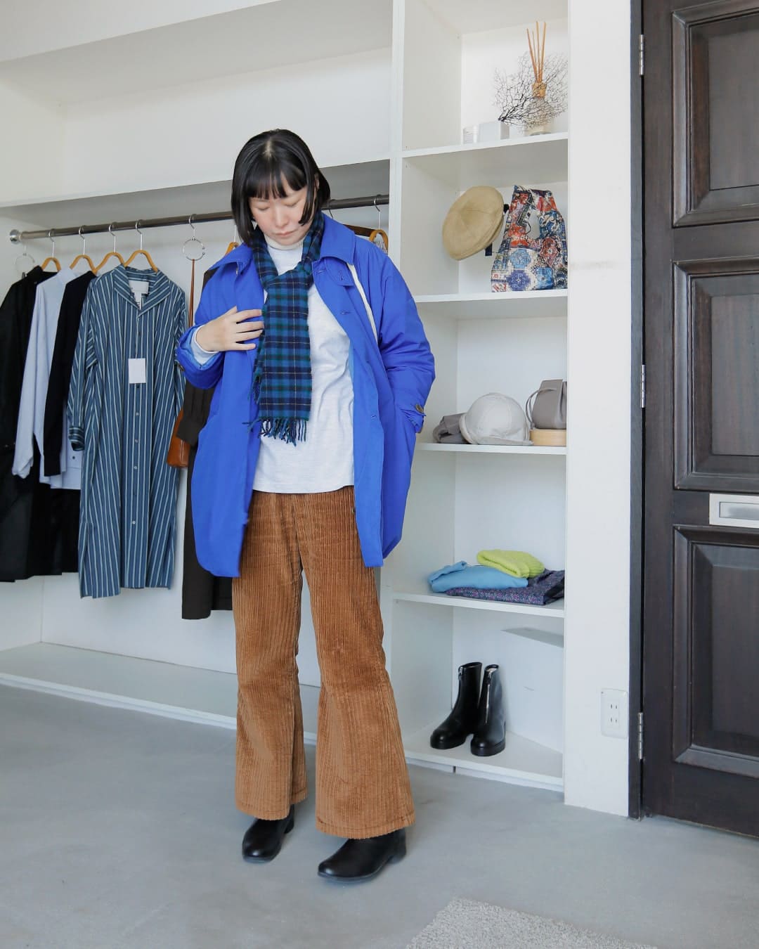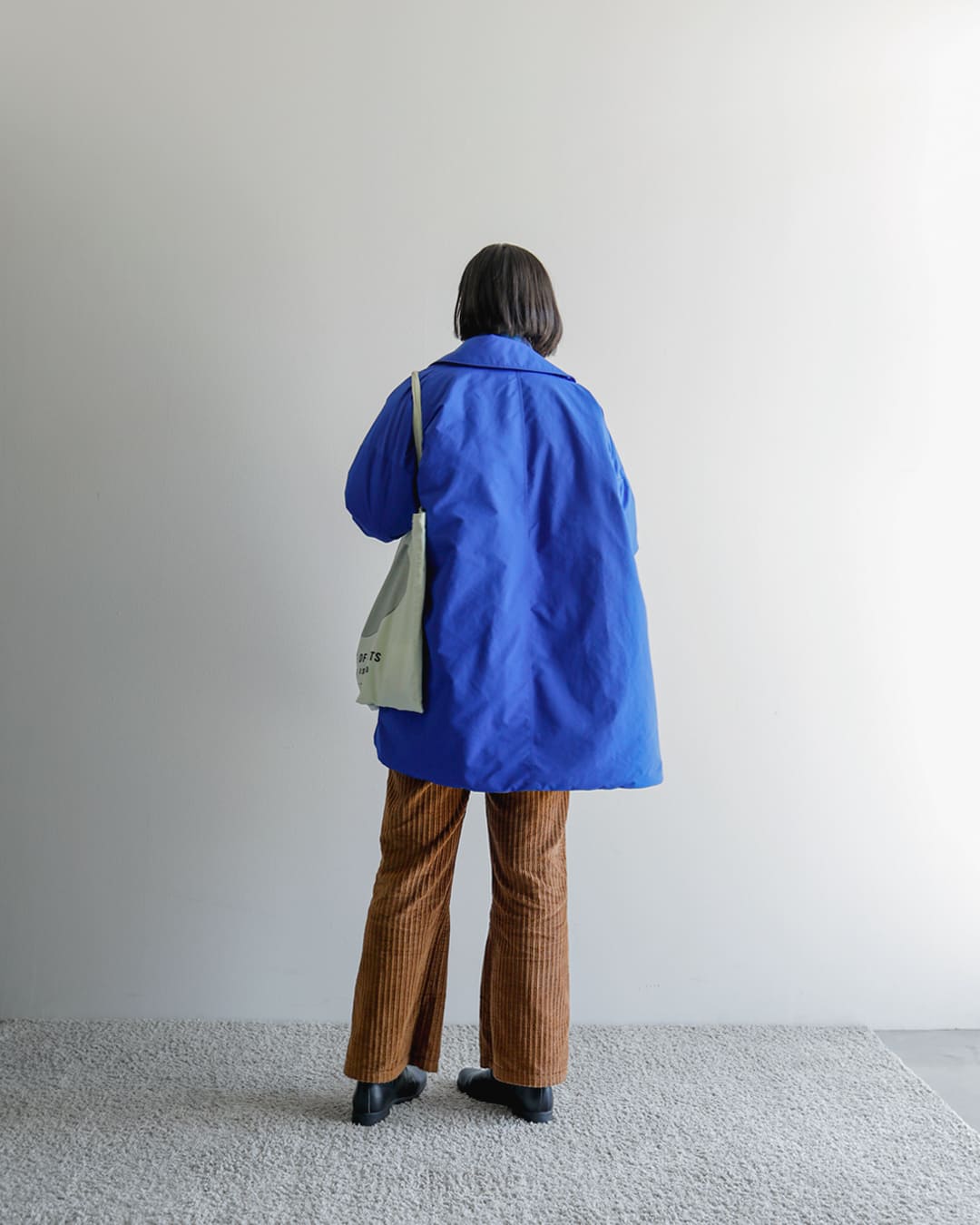 初めはデニムか白パンを合わせようと考えていましたが、ブランドのルックでこの青のコートにブラウンのレザーの手袋を合わせたカラーリングが素敵だったので、少し真似してブラウンのボトムをチョイスしてみました。