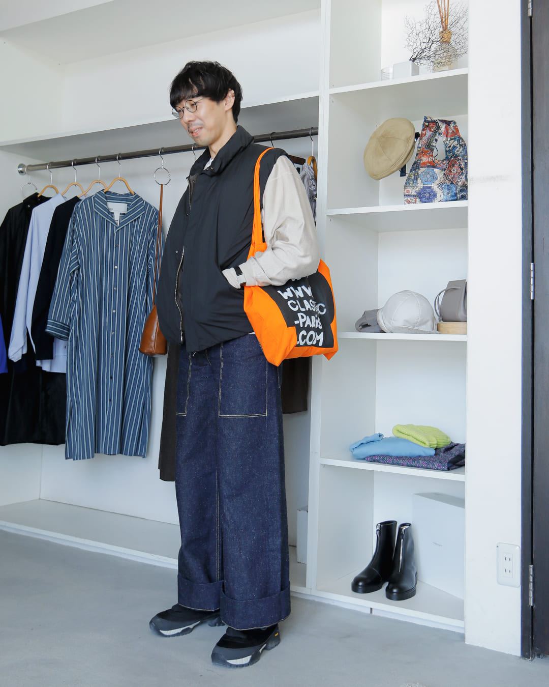 中に着たトップスは姉妹店iromaで取り扱いのMEDIUM SPORTSWEARというブランドのもの。たっぷりとボリュームのあるアームホールがお気に入り。