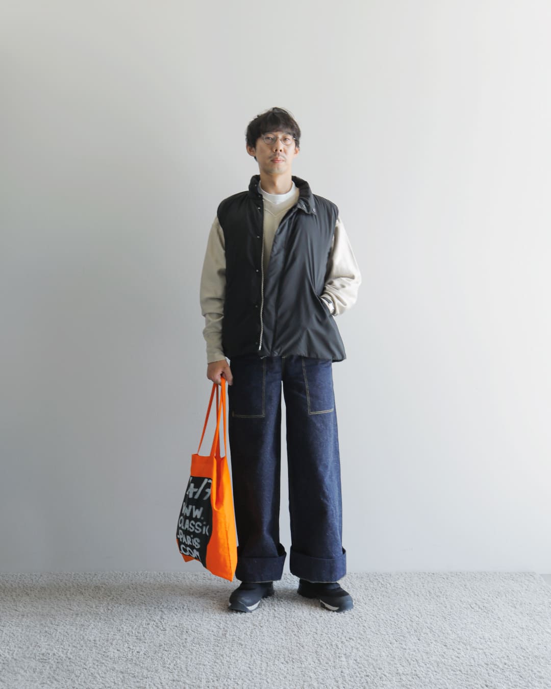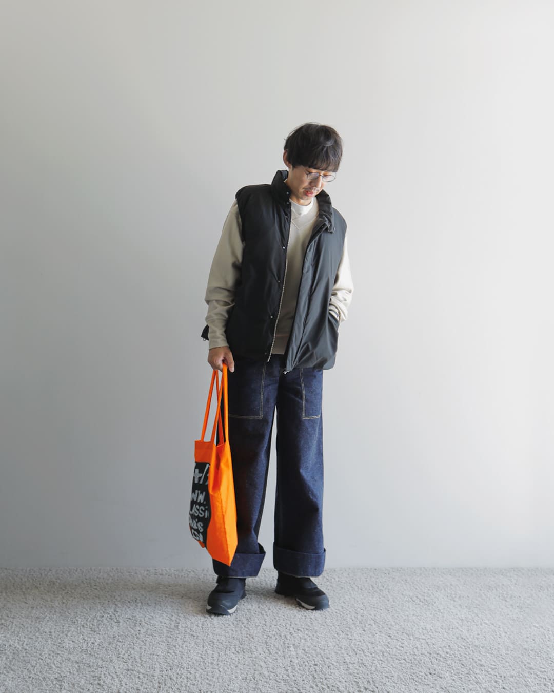 デニムが好きなので今気分のワイドデニムを合わせてみました。ダウンがすっきりしたデザインなので、インパクトのあるグラフィックのバッグを差し色にしています。
