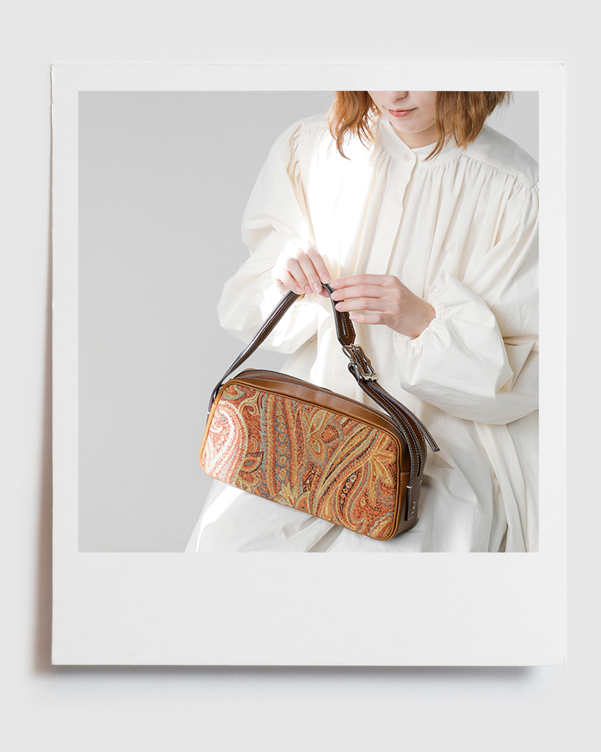 コロンとした丸みのあるボックス型のショルダーバッグ。まるでヴィンテージかと見紛うオリジナルのジャガード生地×カーフスキンの異素材ミックスはクラシカルでラグジュアリー。どこかウエスタンなデザインのバックルもアクセントになっています。 |