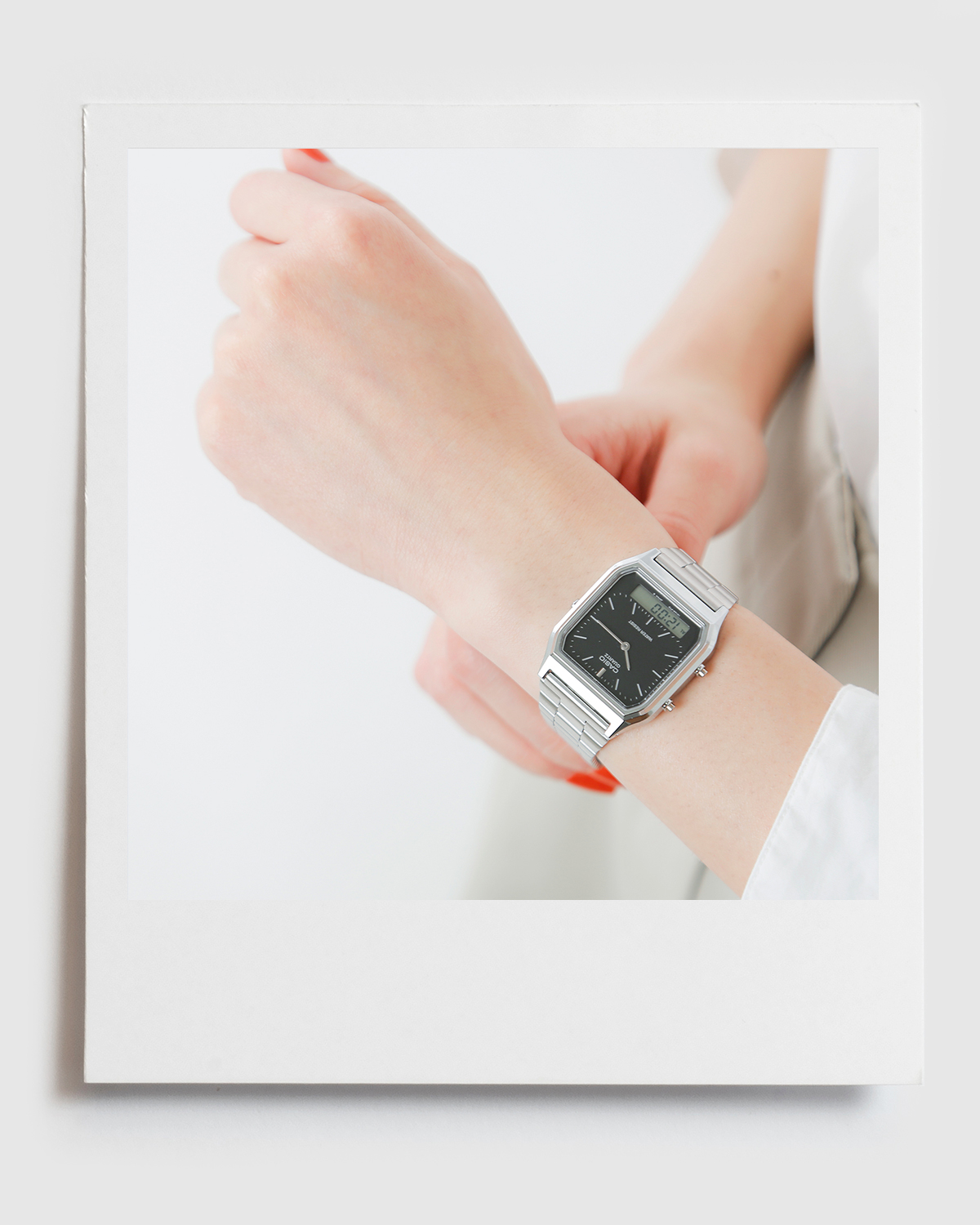 大きめのスクエアフォルムにメタルバンドが、レトロな雰囲気漂う腕時計。デジタルとアナログを兼ね備えた文字盤は見やすく、デイリーユースにぴったり。スタイリッシュな細身のケースと、ステンレススティールのベルトで見たい目以上に軽く、快適な着け心地。 |