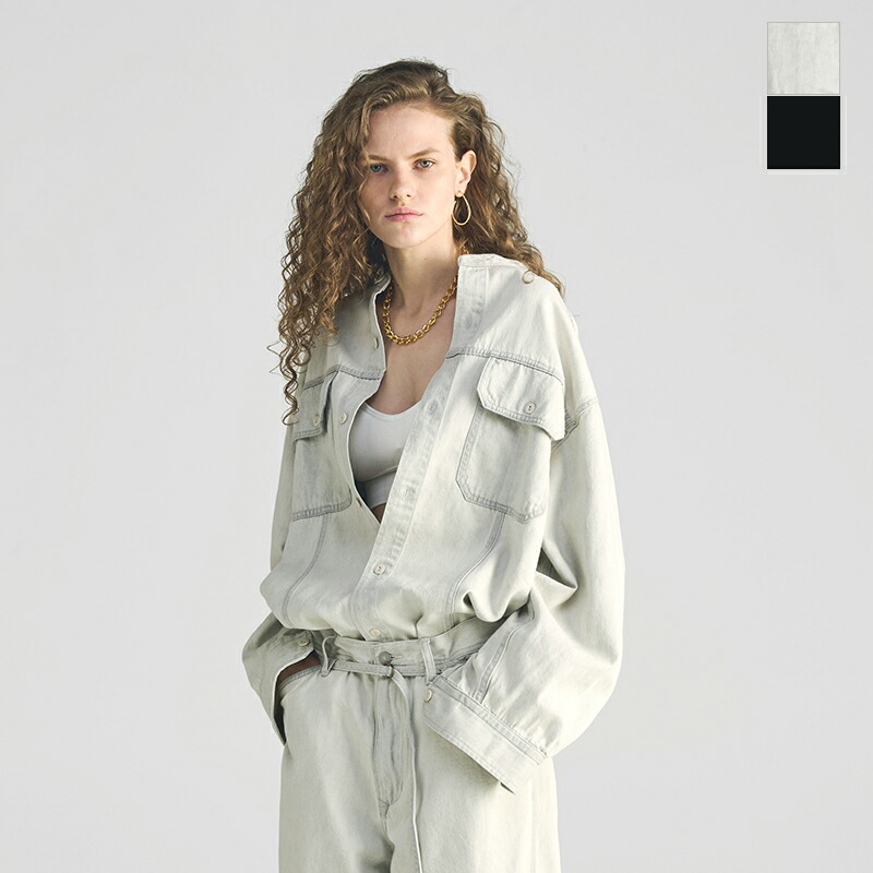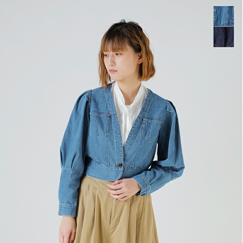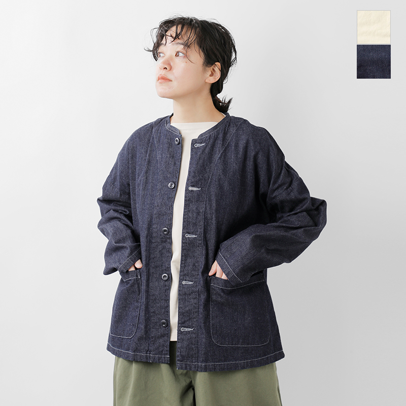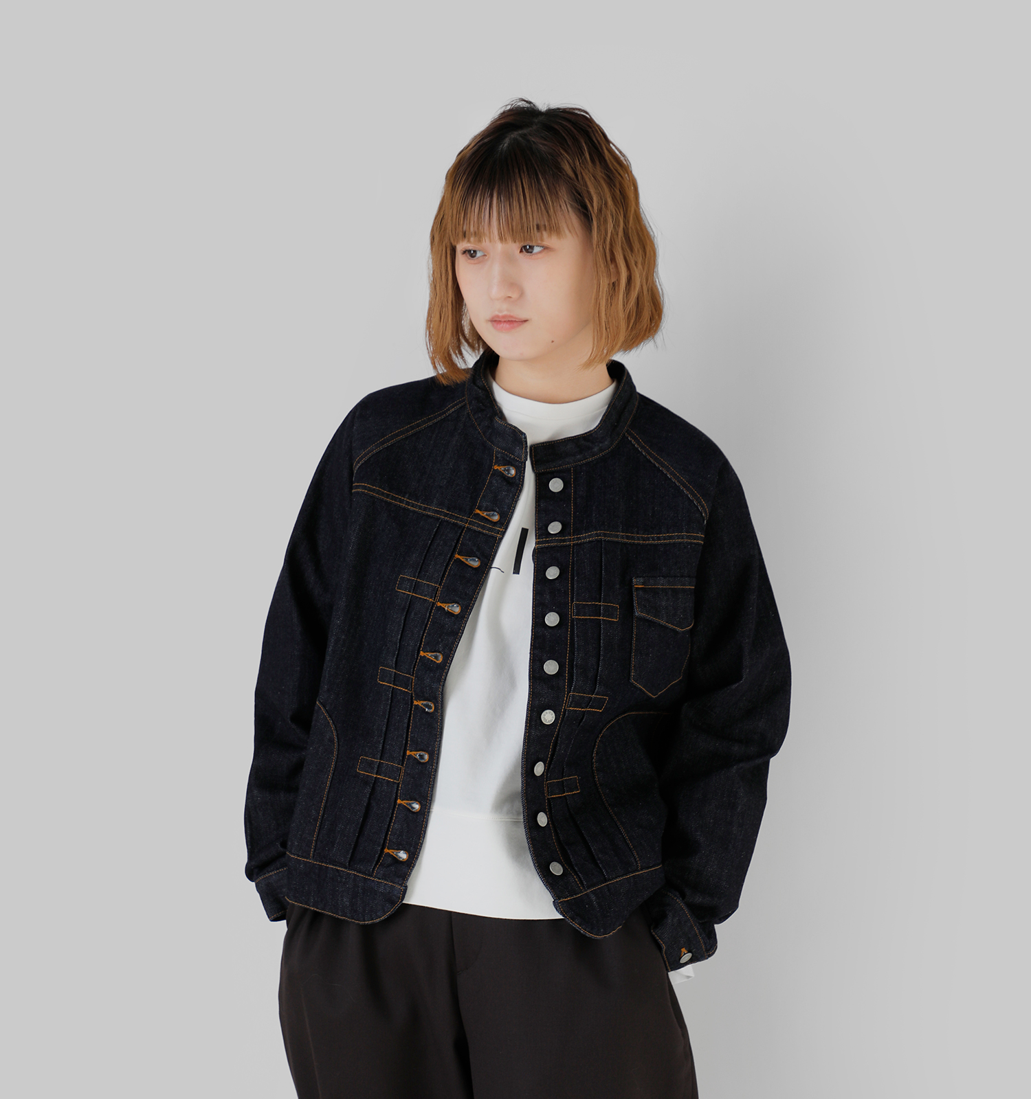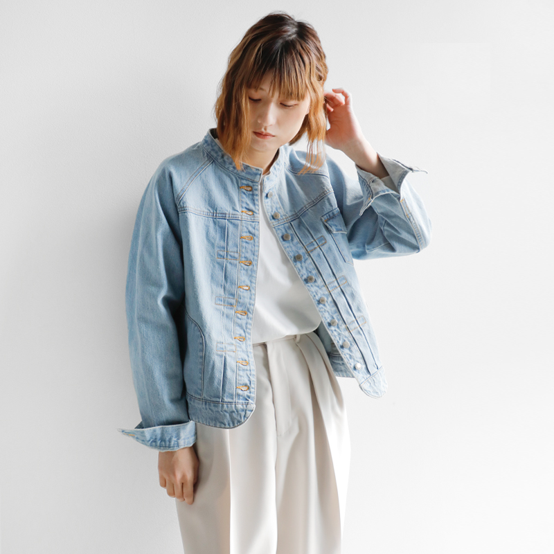 Si-Si-Siのデニムバンドカラージャケット。一工夫加えられた珍しいバンドカラーで女性らしく、すっきりした首元に。製品洗いを施し上質なデニムが魅力。カジュアルながら、どこか上品さも感じさせる一枚に仕上がっています。
