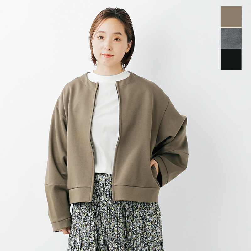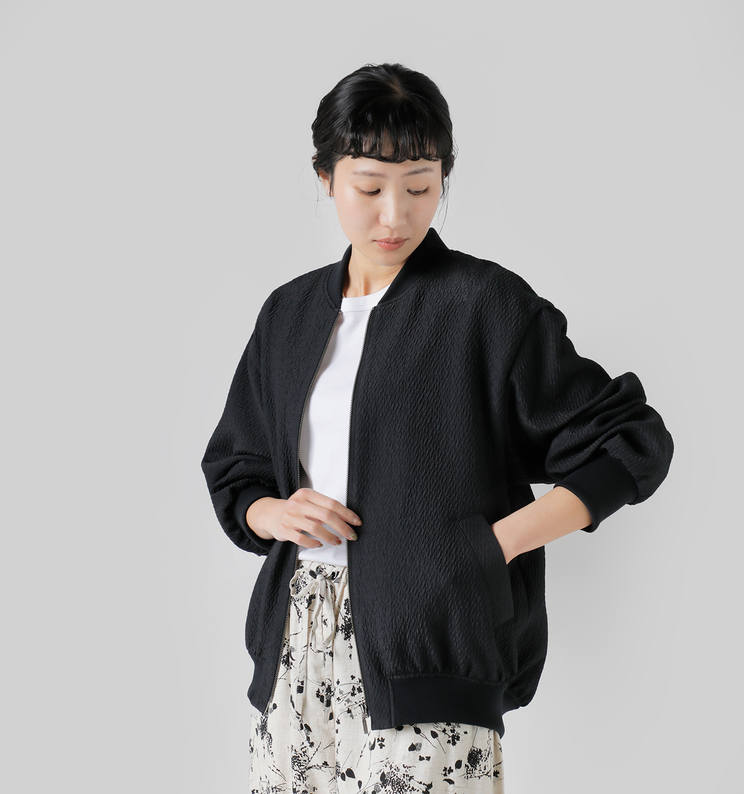 mizuiro indのジャガードジップブルゾン。首元や袖口のリブのあしらいはきちんとブルゾンらしく硬派なデザイン。それでいて柔らかな印象をあたえるのはなんといっても上品な表情が特徴的な膨れジャガード生地。やわらかな女性らしさにあふれた印象です。