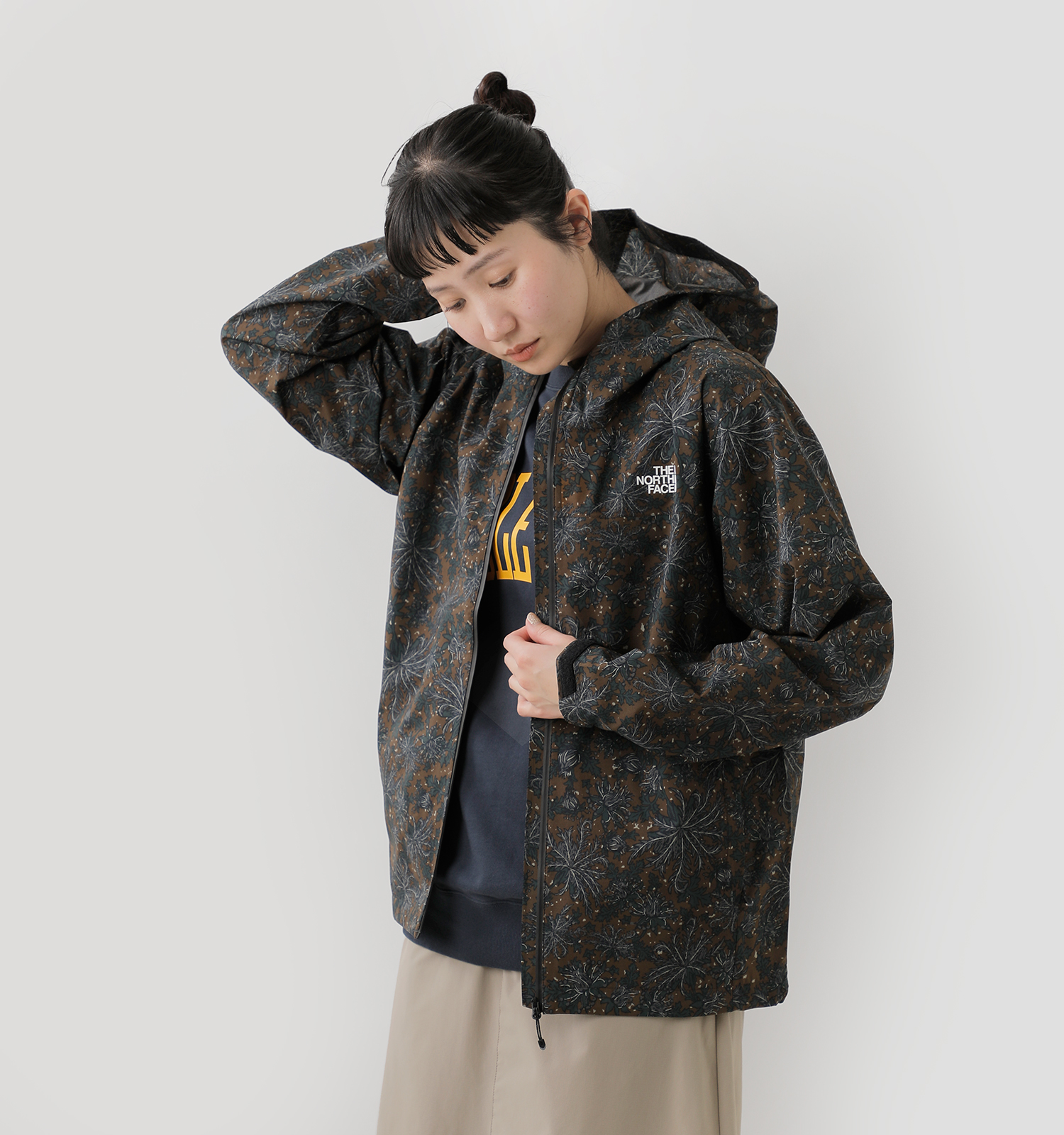 THE NORTH FACEのよりベンチャージャケット 。高原に咲くチングルマの花のグラフィックが印象的。携行に便利なスタッフサック付きでアウトドアからデイリーユースまで、さまざまなシーンに対応する、日常でもコーディネートしやすいアイテムです。