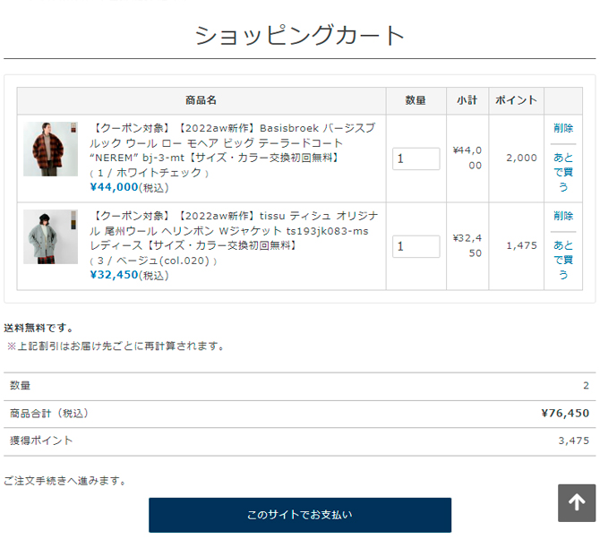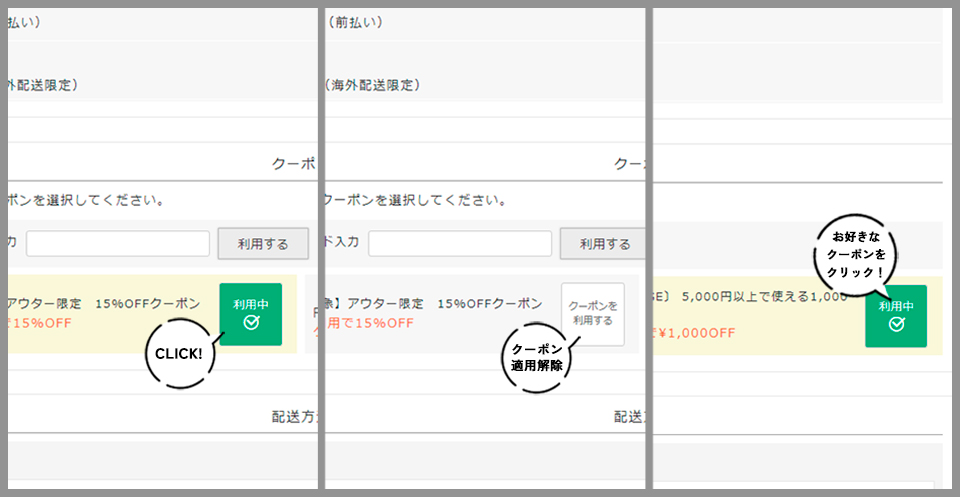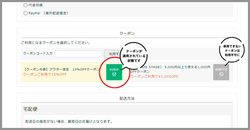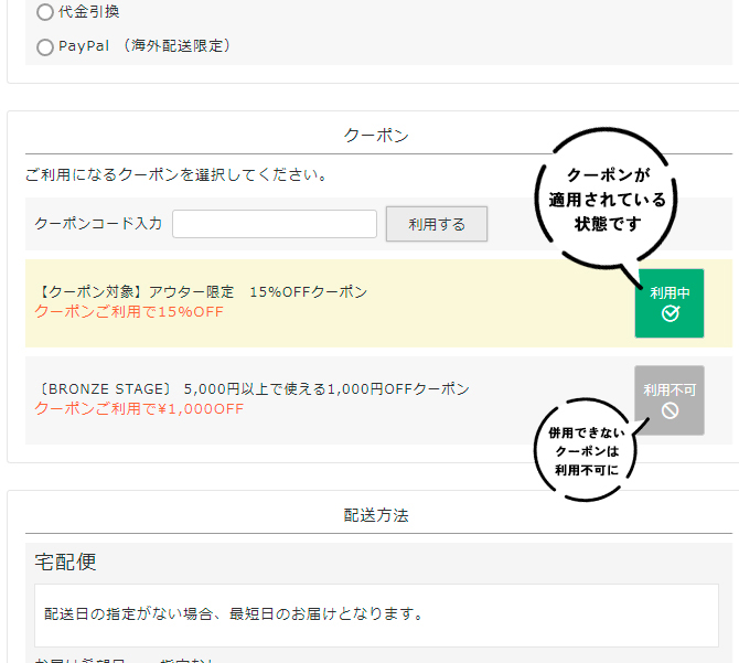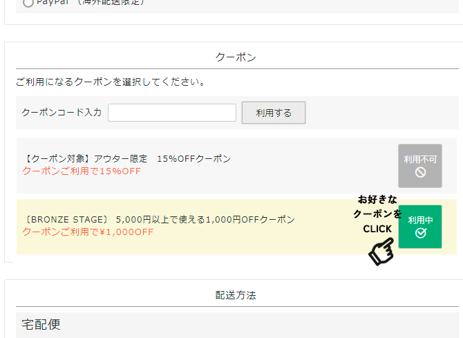 ご注文手続き画面の【クーポン】の項目よりご利用になりたいクーポンを選択。適用されているクーポンは右側に「利用中」と表示されます。すでにクーポンを選択している場合、併用できないクーポンについては「利用不可」と表示されます。