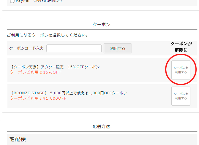 その他のクーポンをご利用になりたい場合は選択中のクーポンの「利用中」ボタンをクリックし解除後、ご利用になりたいクーポンをご選択ください。