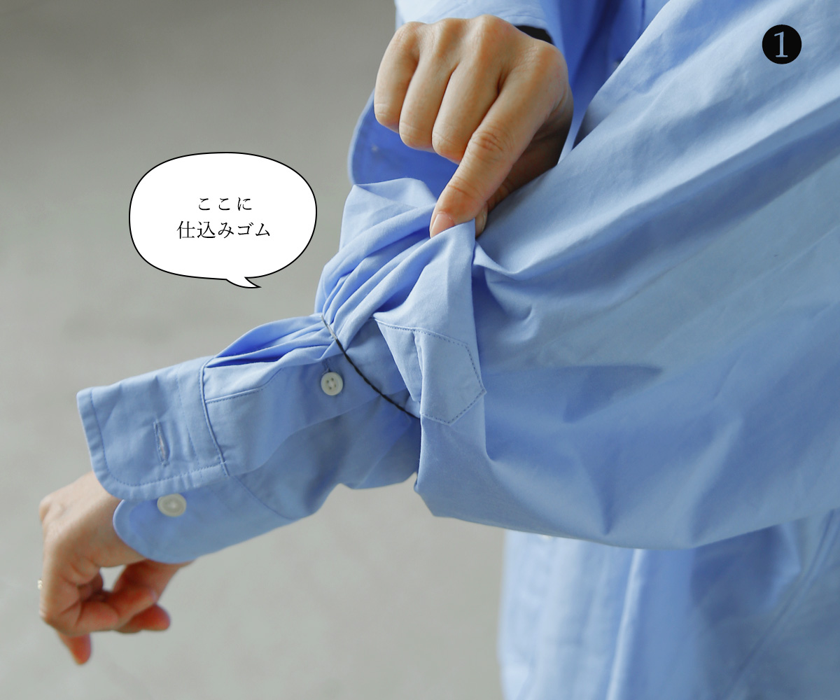 ❶カフス部分の上のあたりにシャツの上からゴムを留めます。シャツをゴムごと上にぐいと上げます。