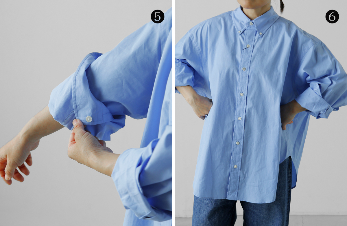❺袖が長すぎてボリュームが出過ぎてしまう場合には、飛び出した袖先をさらに下に向かってひと折しても◎。