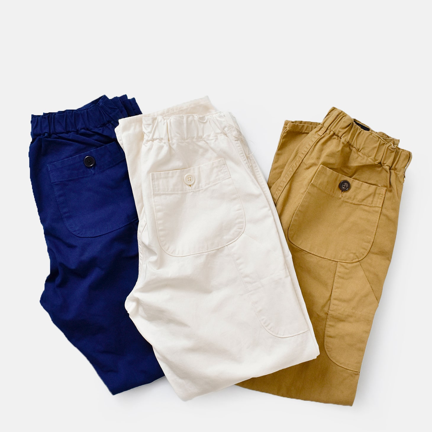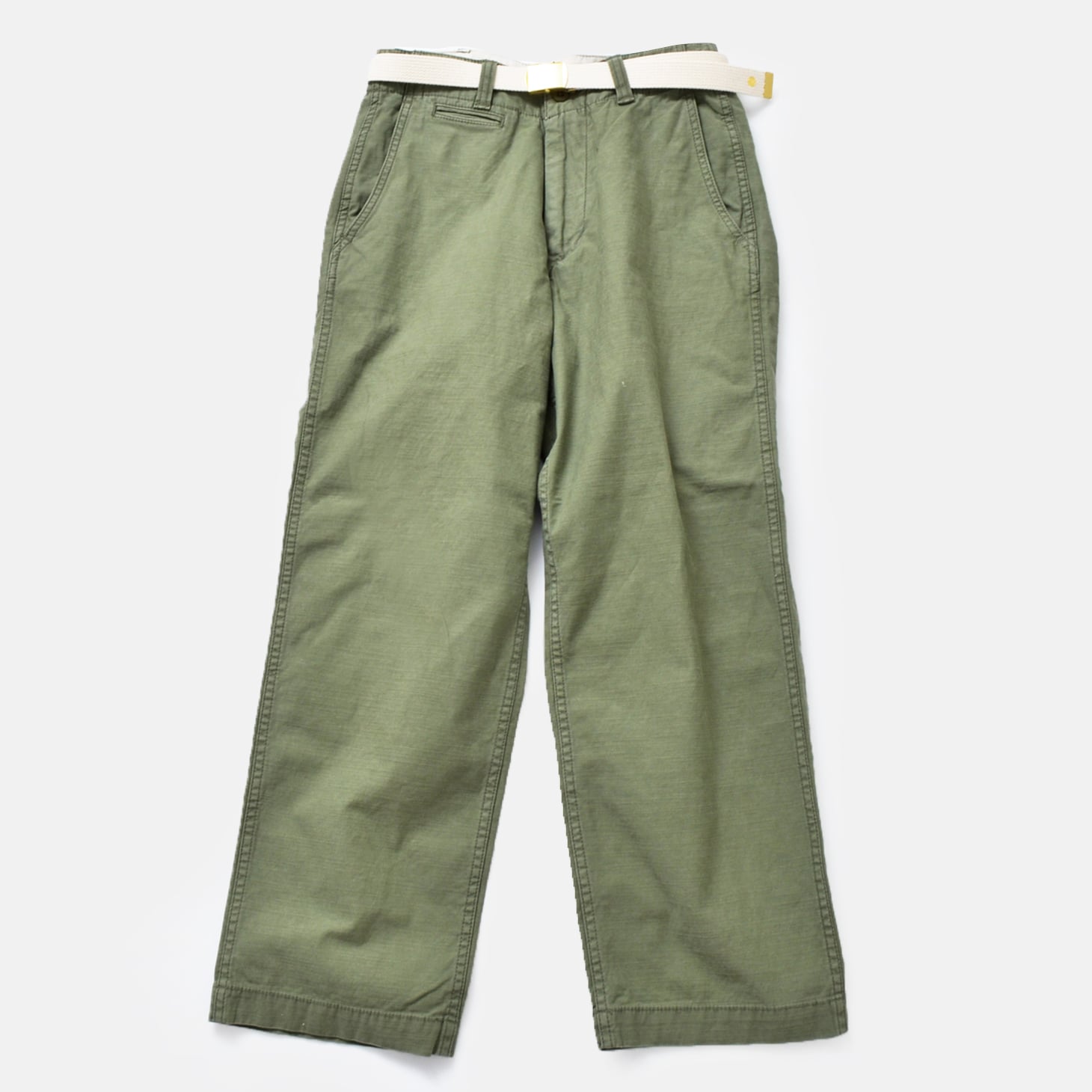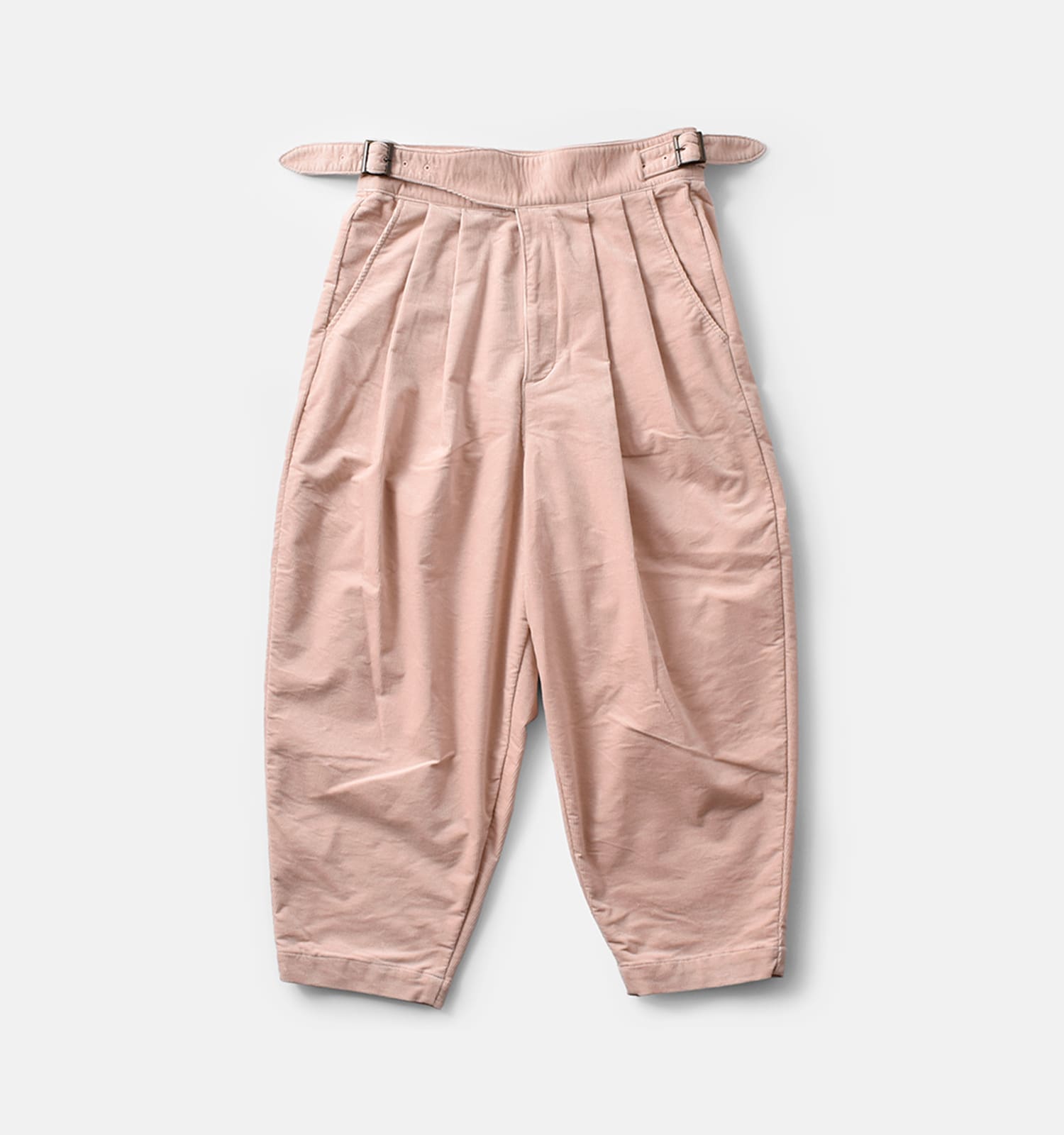 高密度のチノクロス生地を使用した独特のハリ感が特徴的。ウォッシュ加工が施されており、あたり感や色落ちなど履き込んで育てるのが楽しみになるパンツです。股上が深くユニセックスで履けるルーズなシルエットもお気に入り。付属のガチャベルトも調整が楽チンで重宝します。 裾をロールアップしたり、サスペンダーを合わせたりしてスタイル変化も可能です。いっぱい履いてガシガシ洗って3年後、5年後の姿に期待大です。