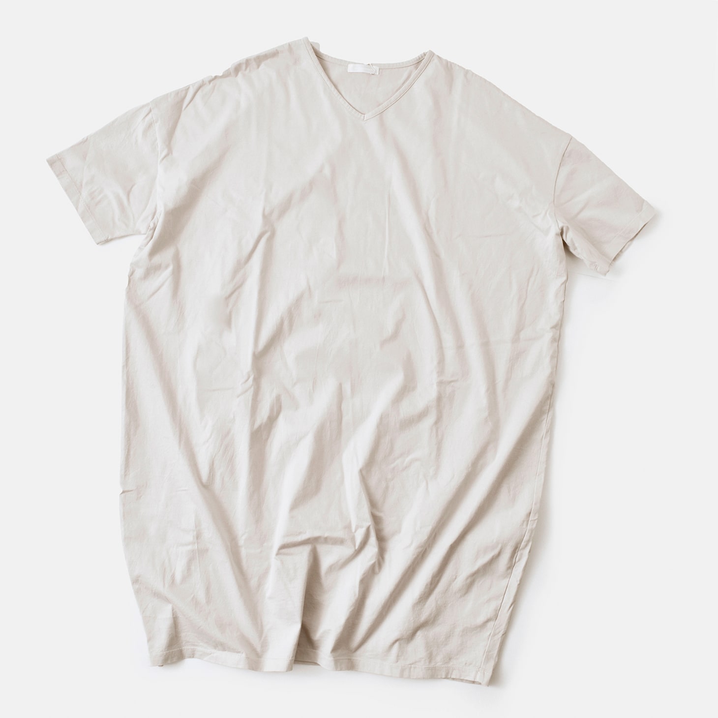 Tシャツだけど、カジュアルすぎる素材感は似合わない私が気に入ってきている一枚です。ドロップショルダーで緩目のシルエット、程よいハリがあり、さらっとした肌触りで綺麗目に着ることができる綿100%のカットソー。154cmでほぼ膝が隠れる丈になります。デニムアンダーパンツを合わせて着ることが多く私の夏の定番。2年前にチャコールを購入しましたが、型崩れや変色もあまり感じず3年目の今年も綺麗に着ることができる状態です。